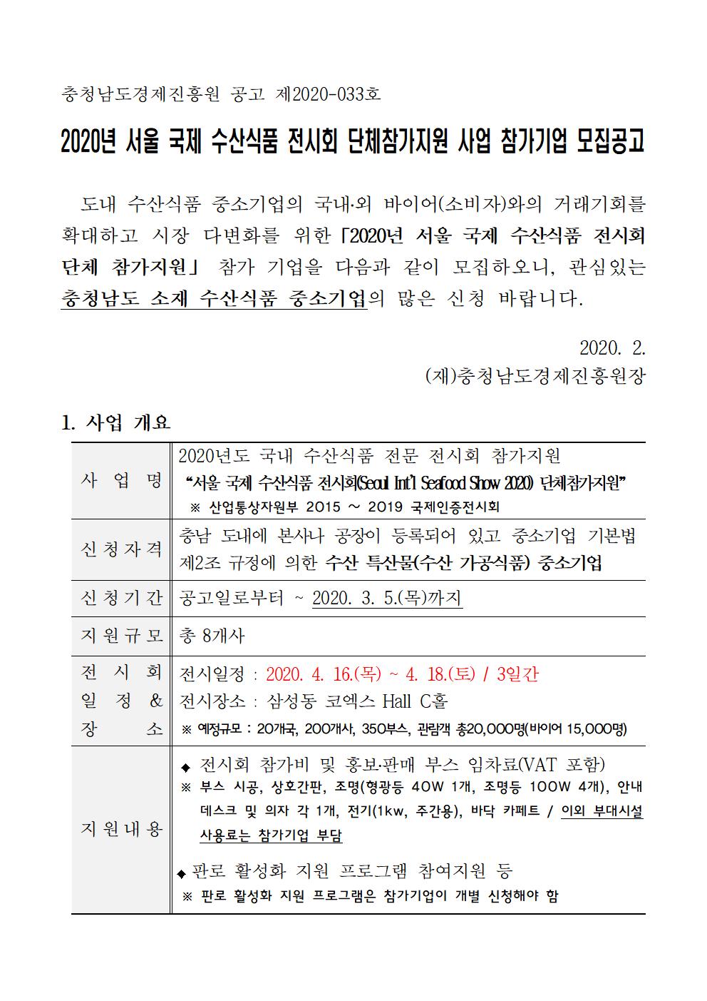 | [수산식품 기업 대상] 2020년 서울 국제 수산식품 전시회 단체참가지원 사업 참가기업 모집 |