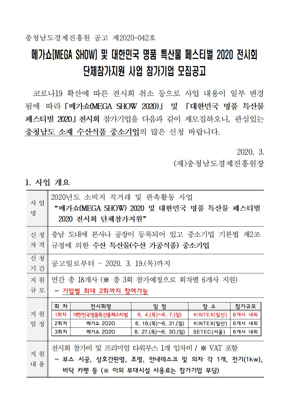 | [수산식품 기업 대상] 메가쇼 2020 및 대한민국 명품 특산물 페스티벌 전시회 단체참가지원 사업 참가기업 모집 |