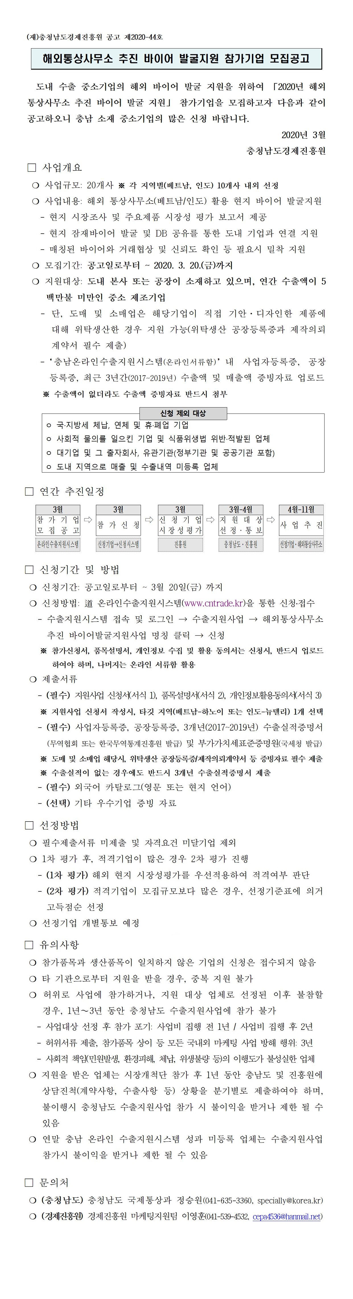 | 2020년도 충청남도 해외 통상사무소 추진 바이어 발굴지원 참가기업 모집안내 |