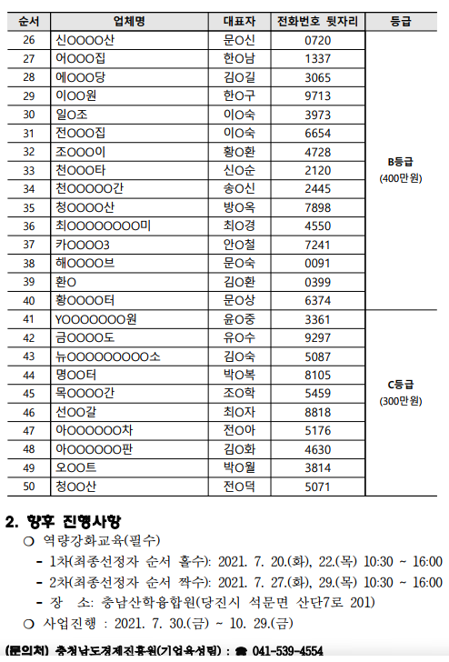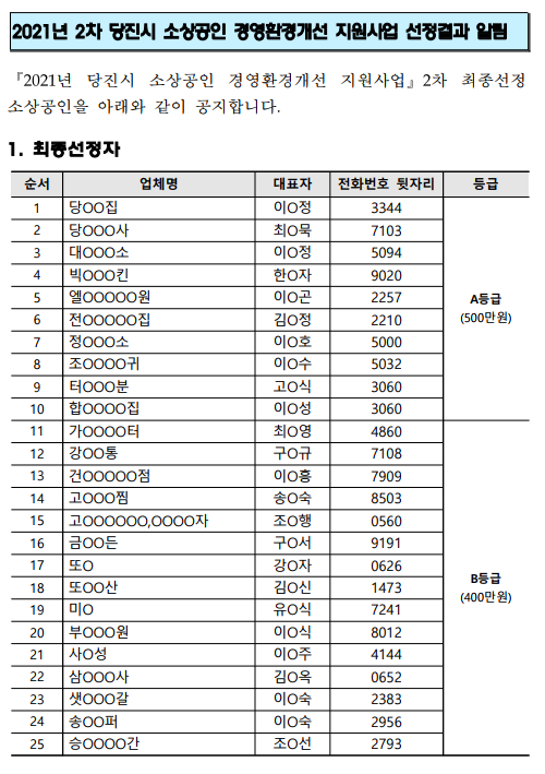 2021년 2차 당진시 소상공인 경영환경개선 지원사업 선정결과