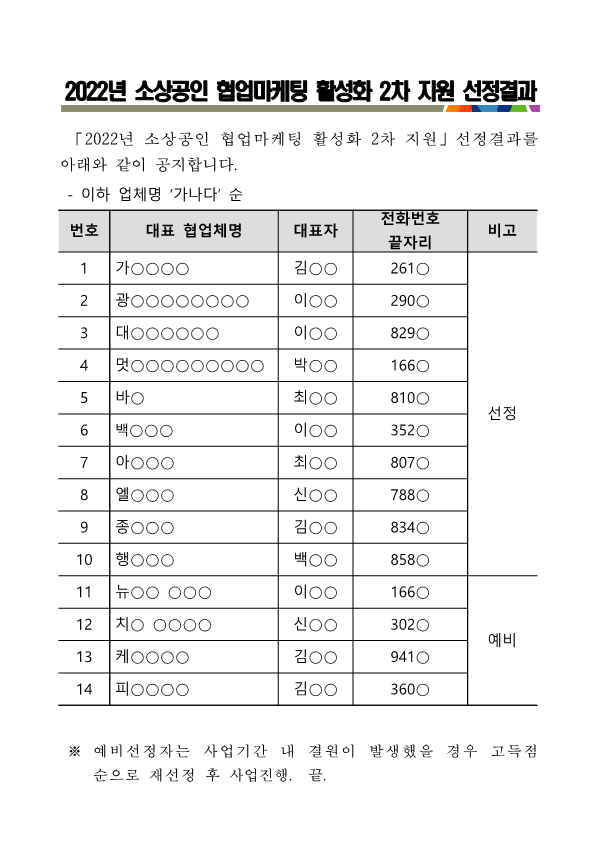 2022년 소상공인 협업마케팅 활성화 지원사업 2차 선정결과