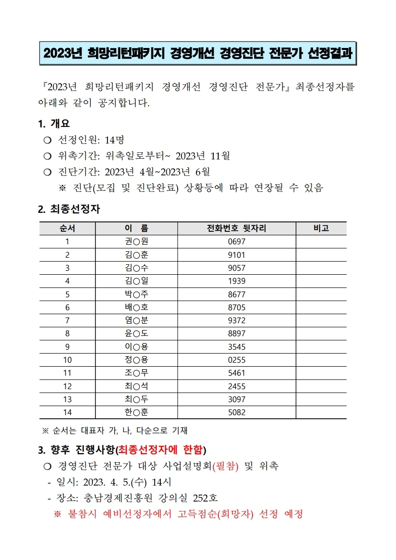 2023년 희망리턴패키지 경영진단 전문가 선정결과