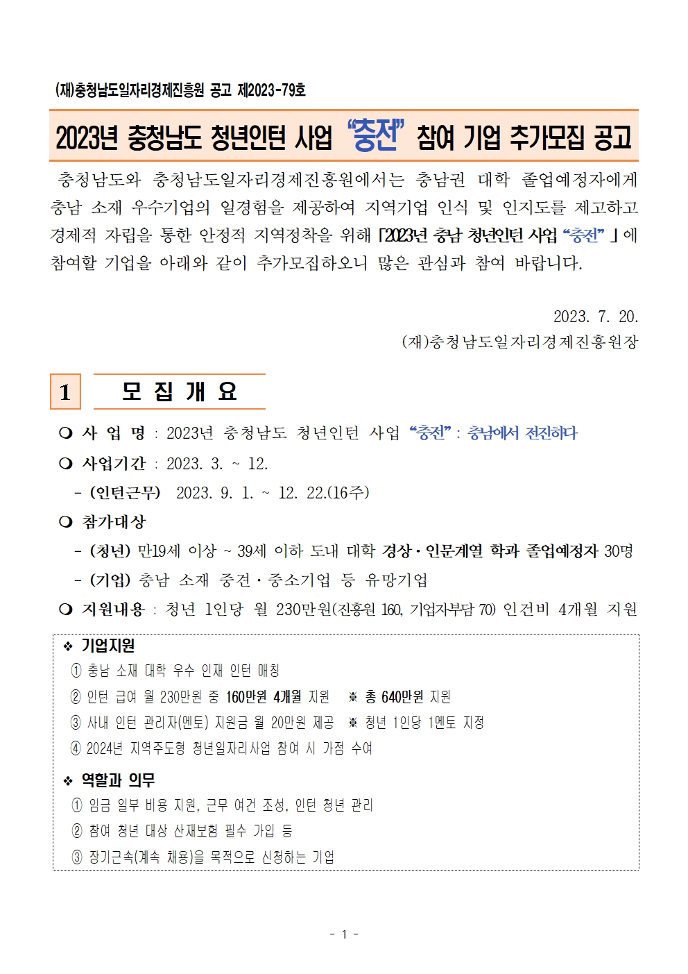 | 2023년 충청남도 청년인턴 사업“충전”참여 기업 추가모집 |
