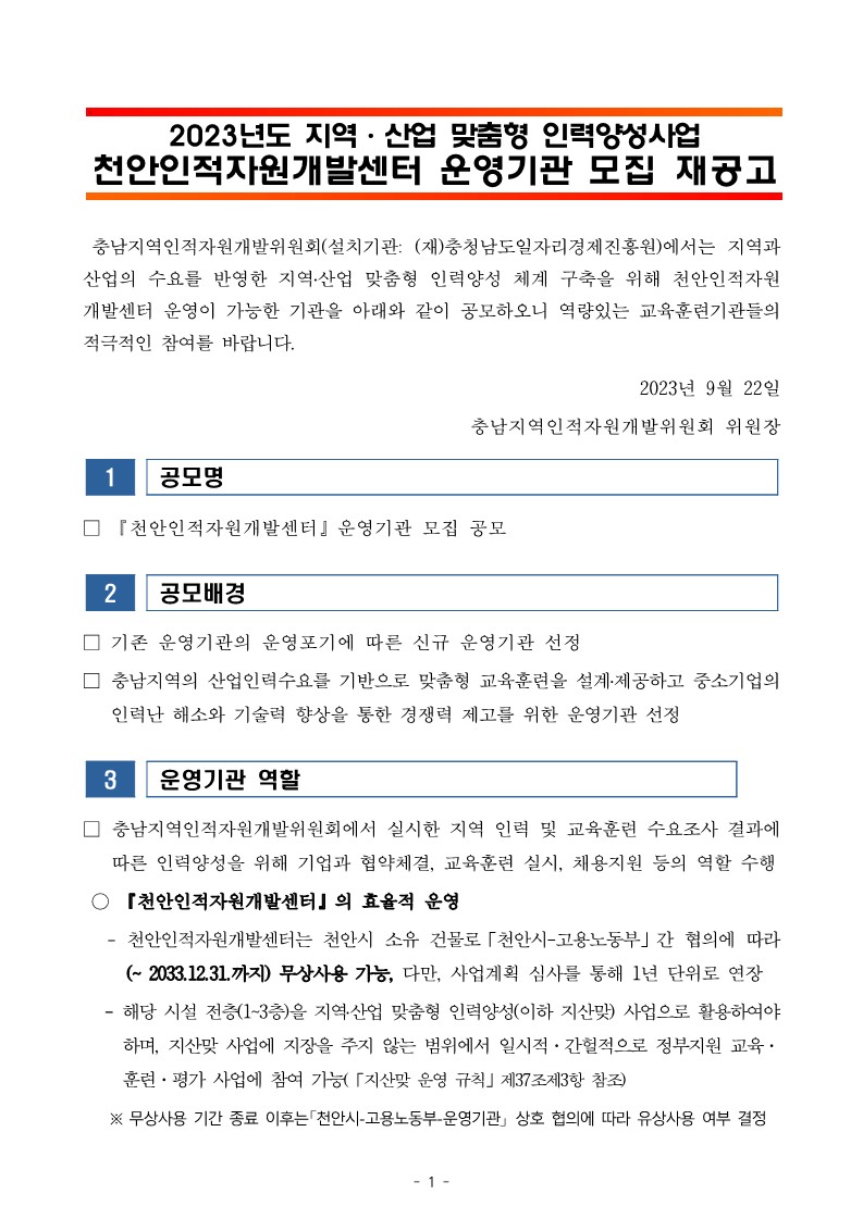 | 천안인적자원개발센터 운영기관 모집 재공고 |