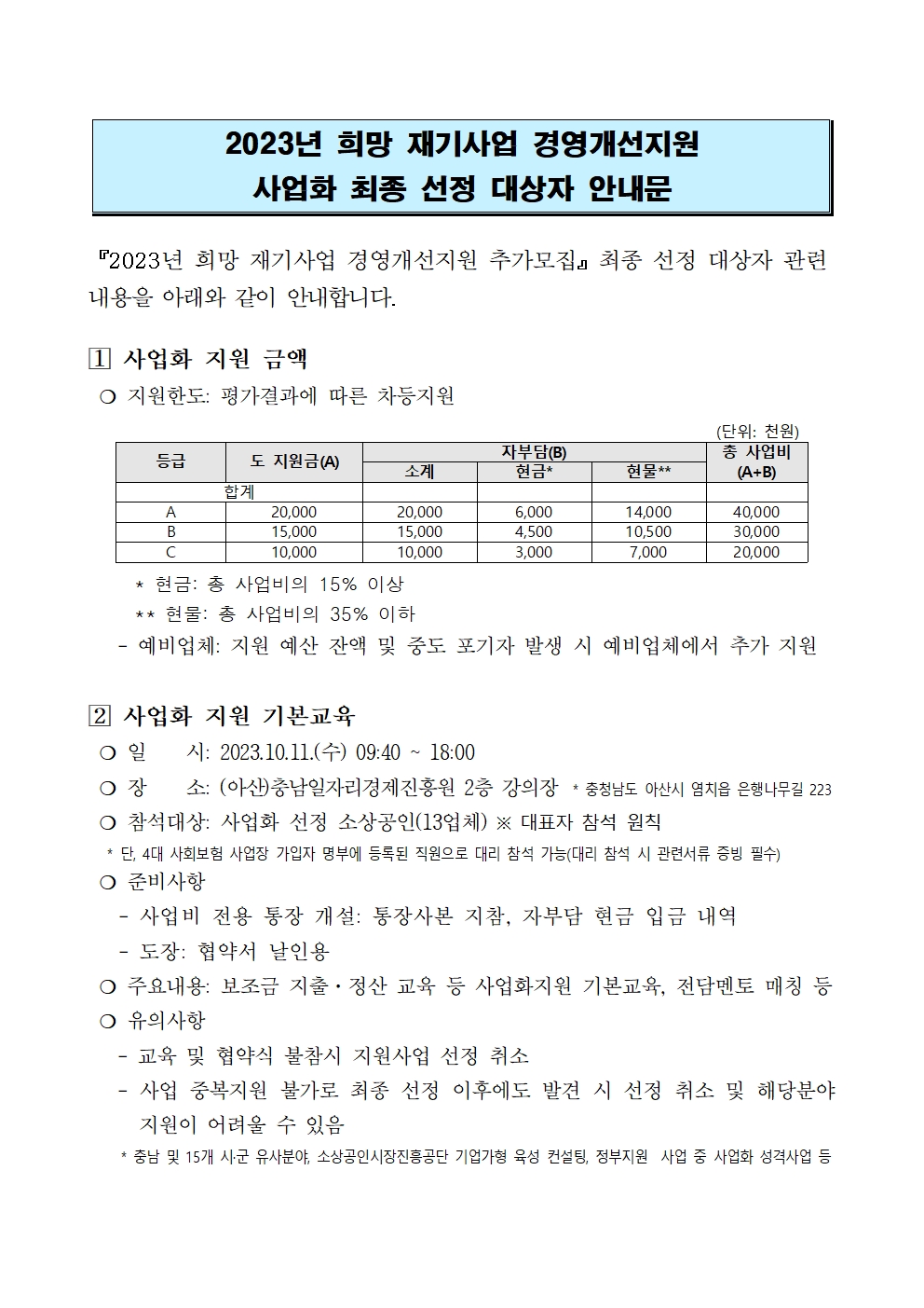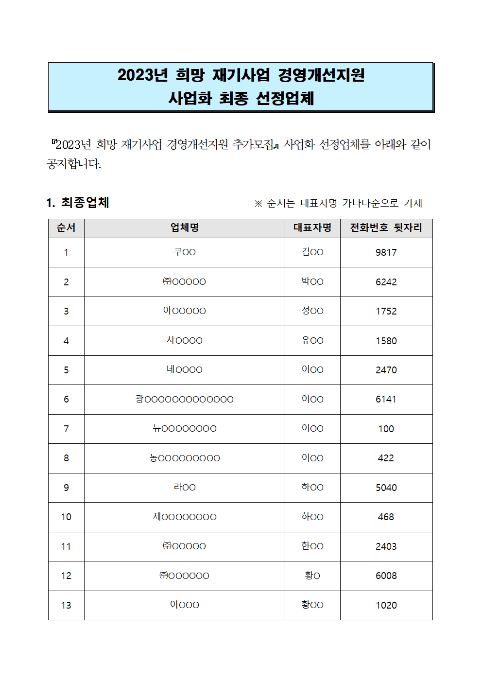 | 2023년 희망 재기사업 경영개선지원 추가 모집 지원업체 선정결과 |