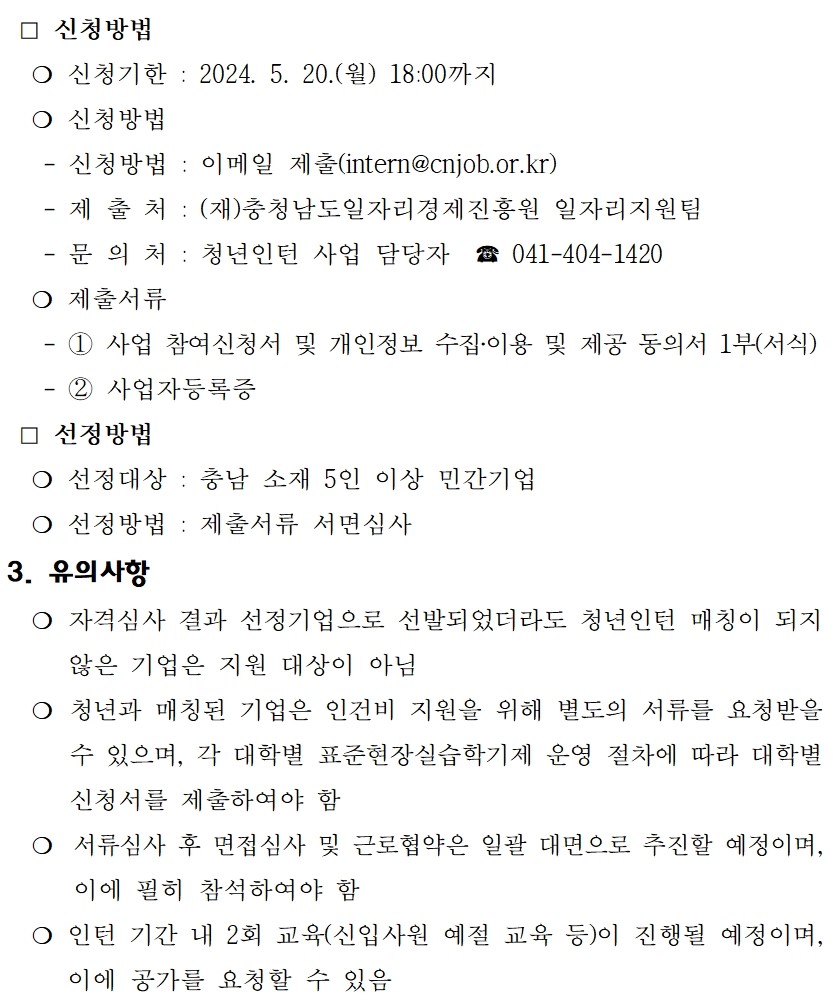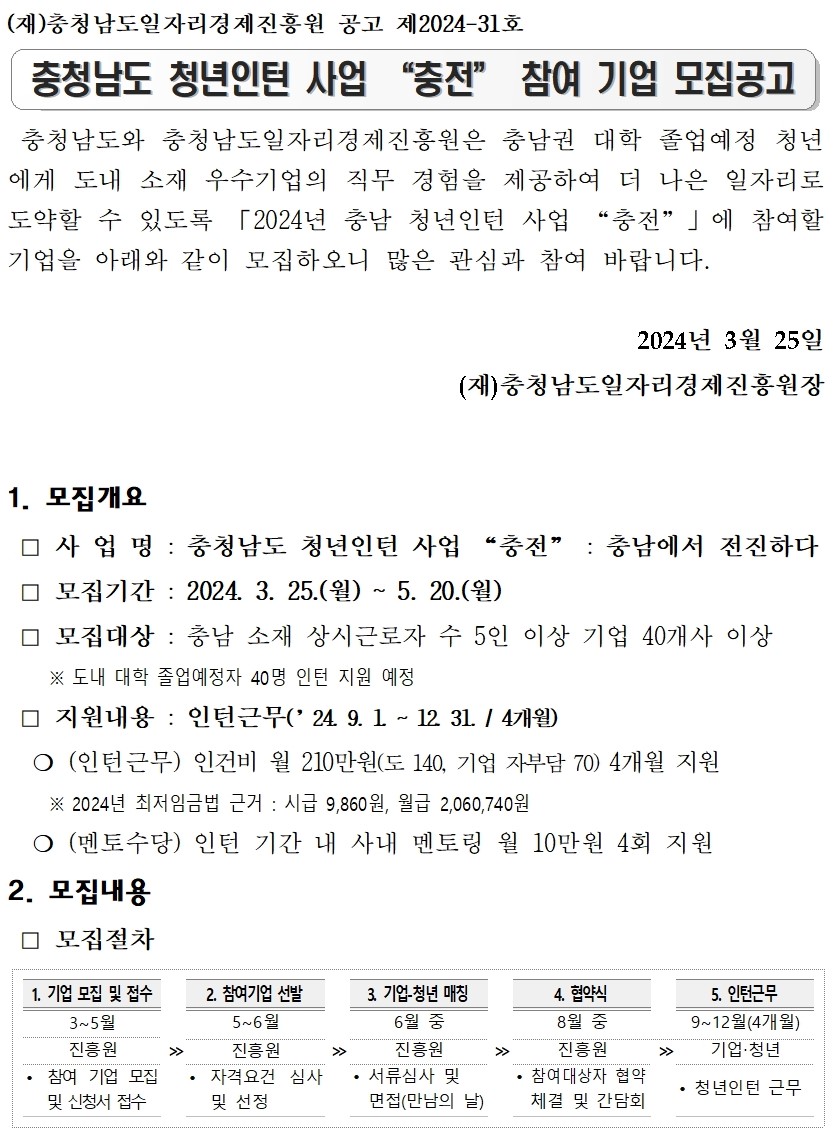 | 충청남도 청년인턴 사업 "충전" 참여 기업 모집공고 |