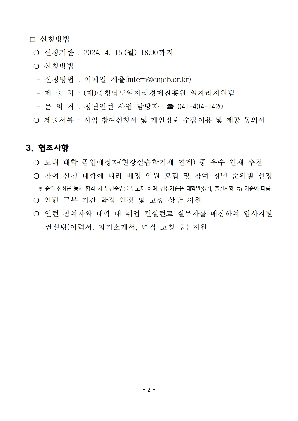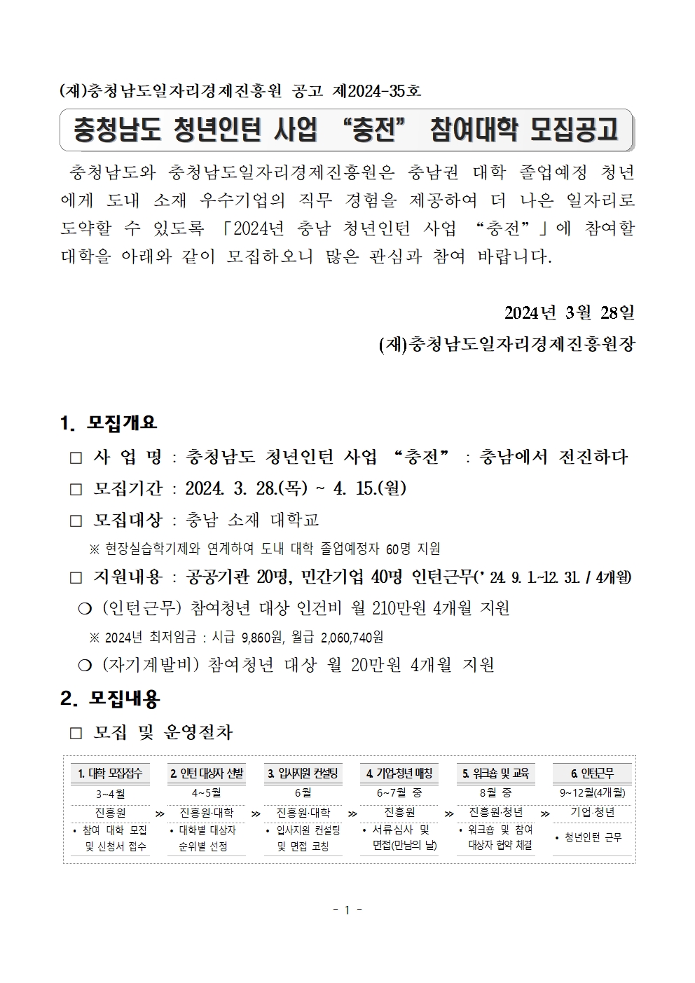 | 2024년 충청남도 청년인턴 사업 "충전" 참여대학 모집공고 |