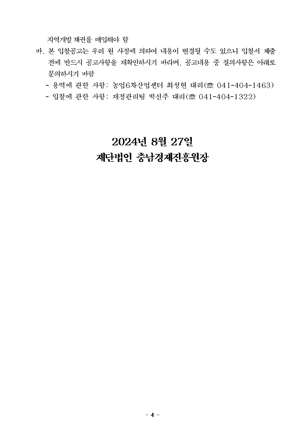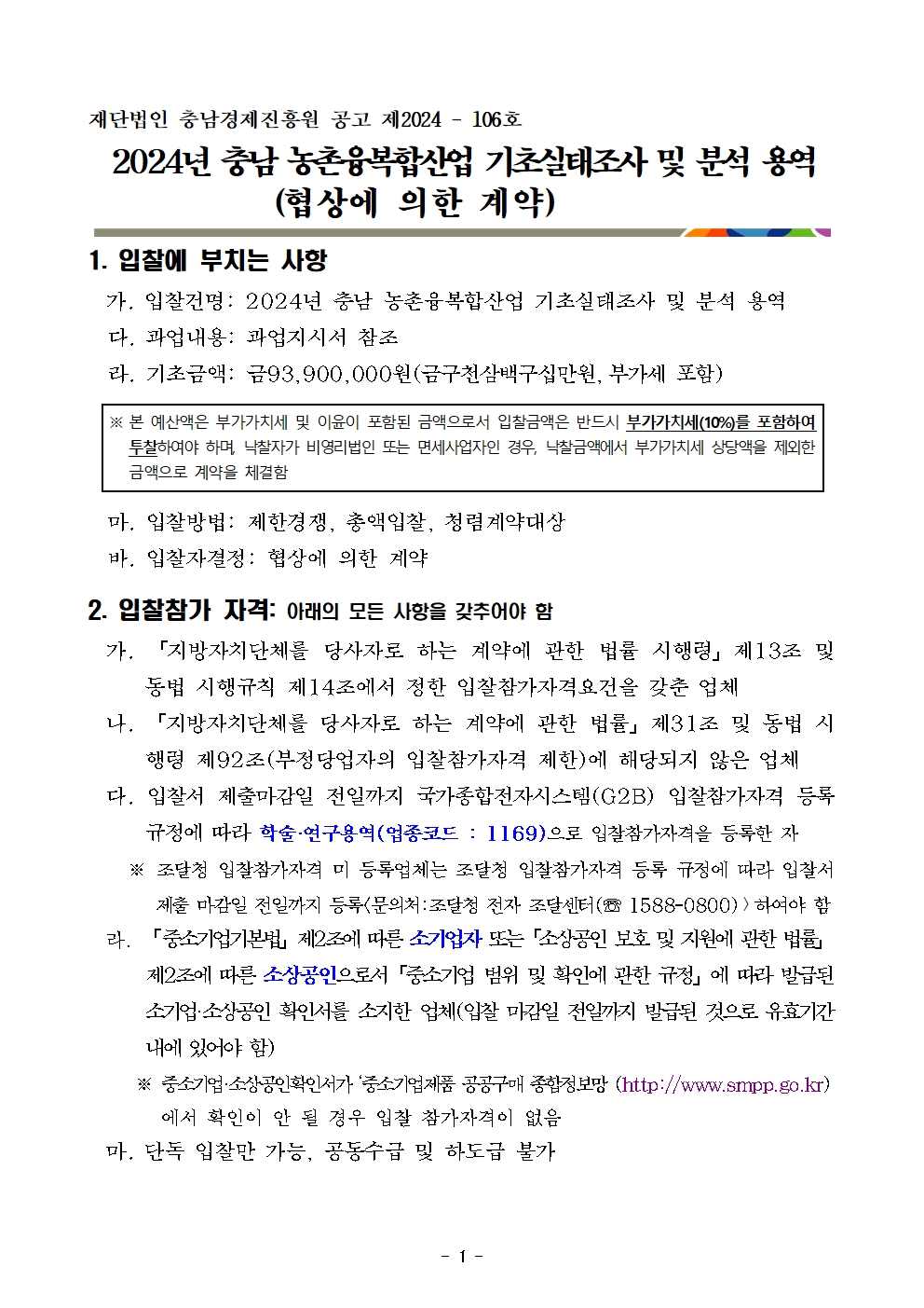 | 2024년 충남 농촌융복합산업 기초실태조사 및 분석 용역 입찰 공고 |