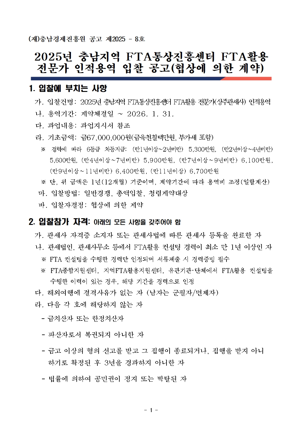 | 2025년 충남지역 FTA통상진흥센터 FTA활용 전문가(상주관세사) 인적용역 입찰공고 |