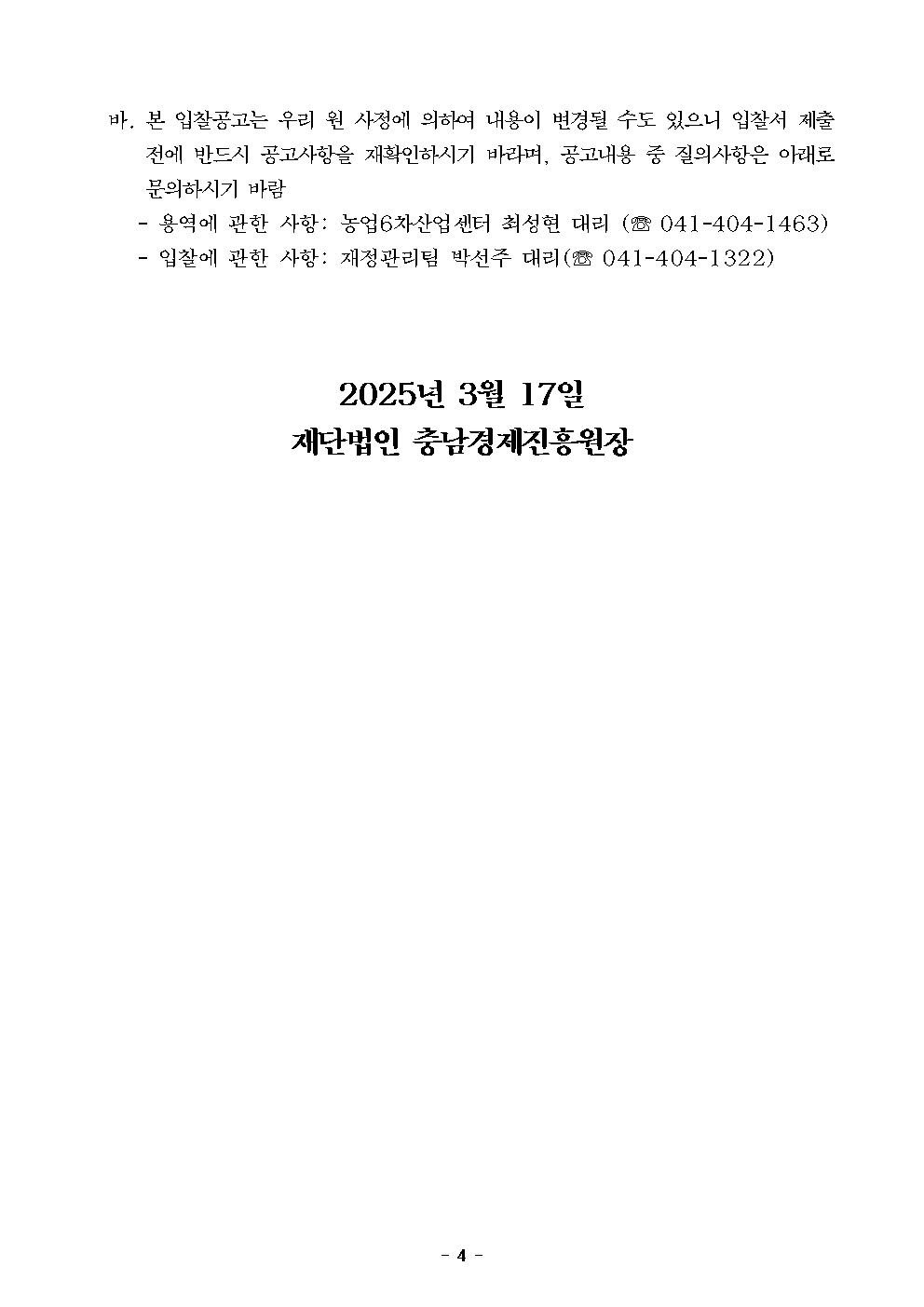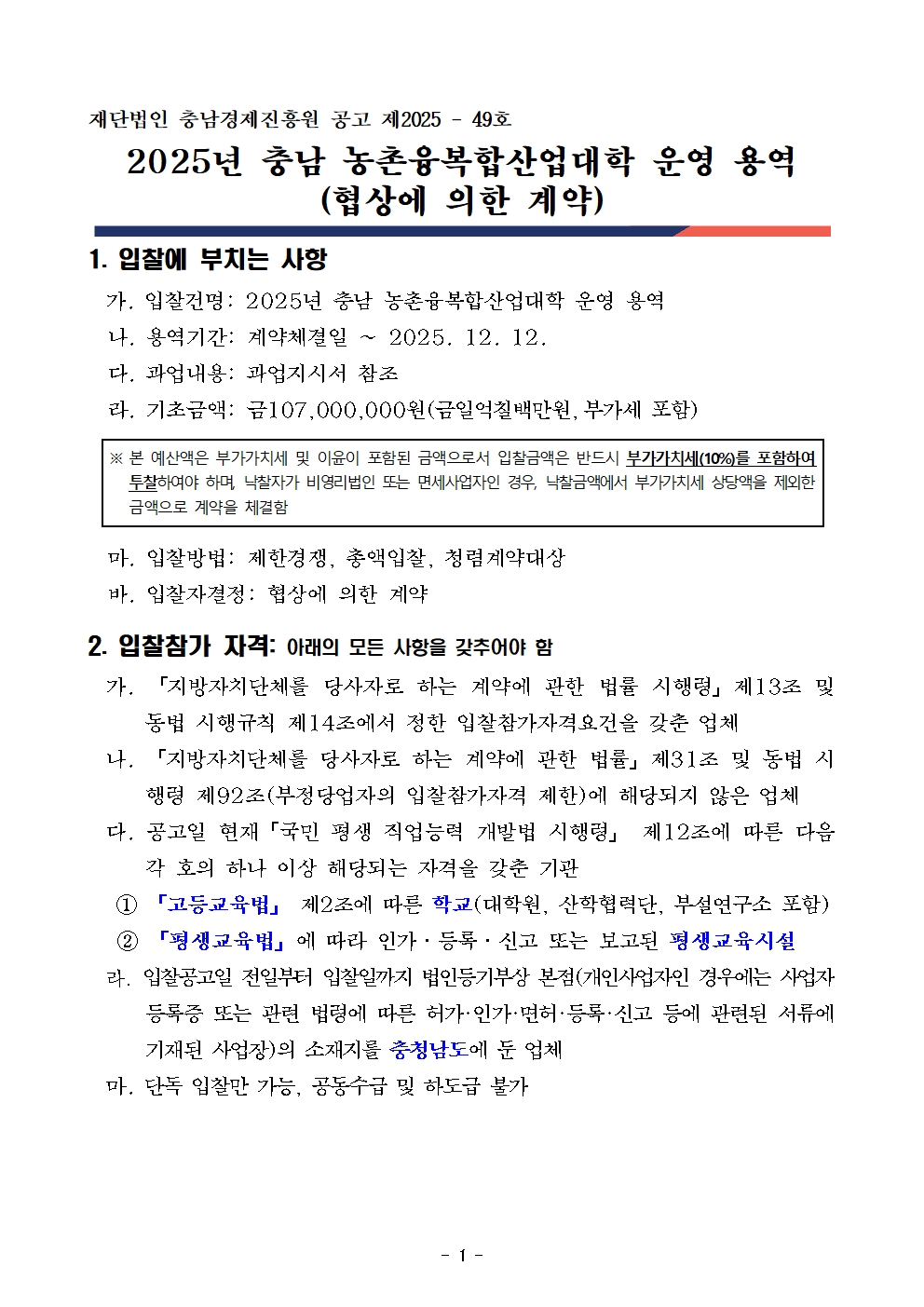 | 2025년 충남 농촌융복합산업 대학 운영 용역 입찰 공고 |