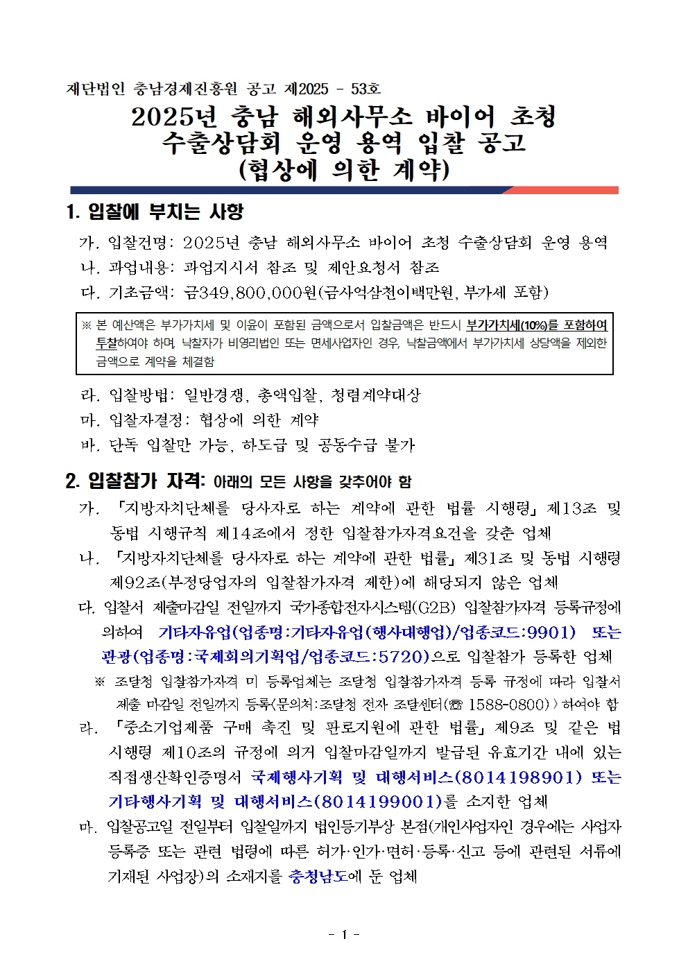 | 2025년 충남 해외사무소 바이어 초청 수출상담회 운영 용역 입찰 공고 |