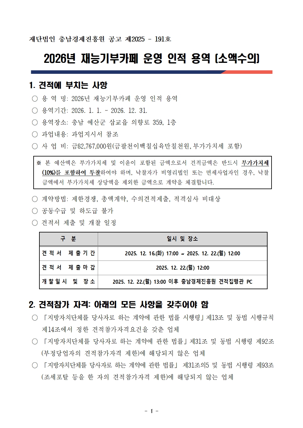 2026년 재능기부카페 카페별무리 운영 인적 용역 소액수의 공고