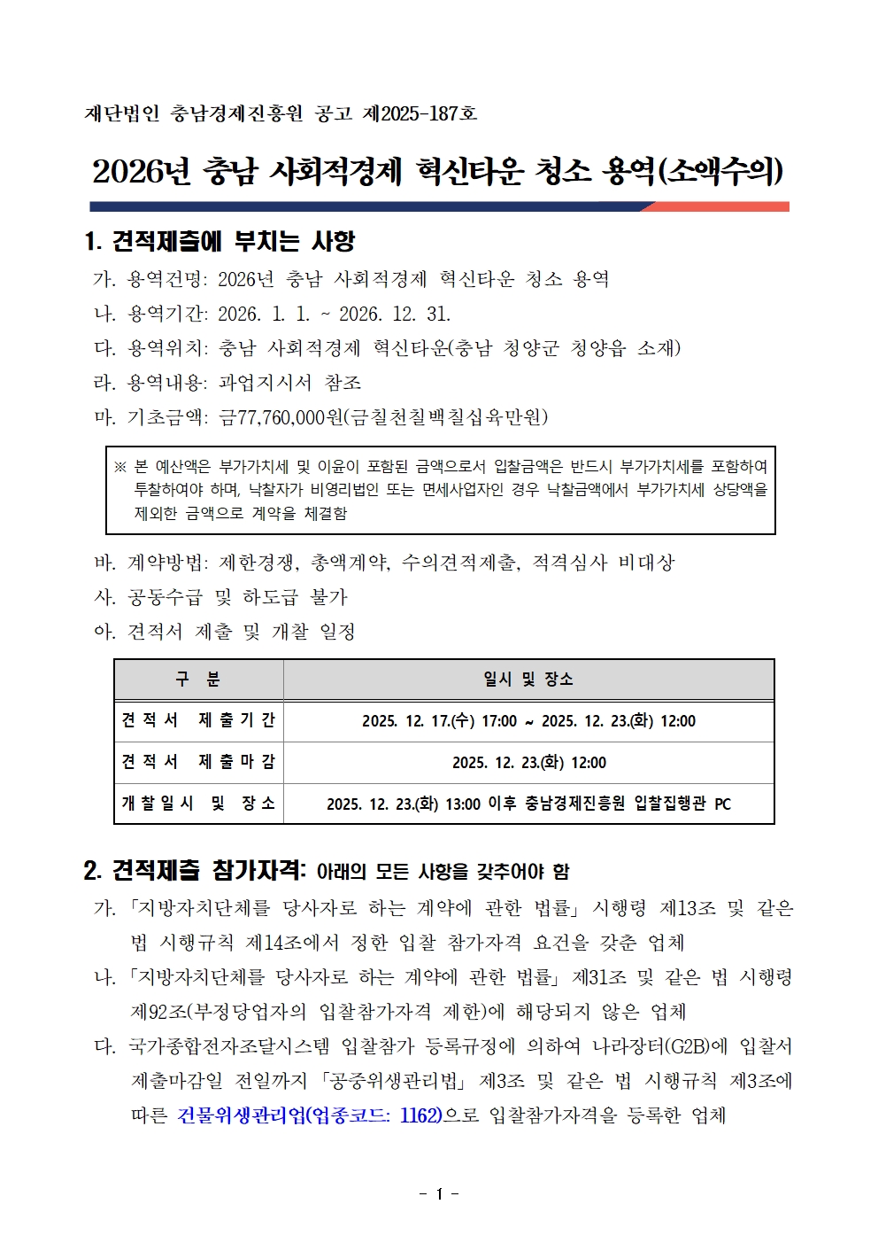 2026년 충남 사회적경제 혁신타운 청소 용역 소액수의 공고