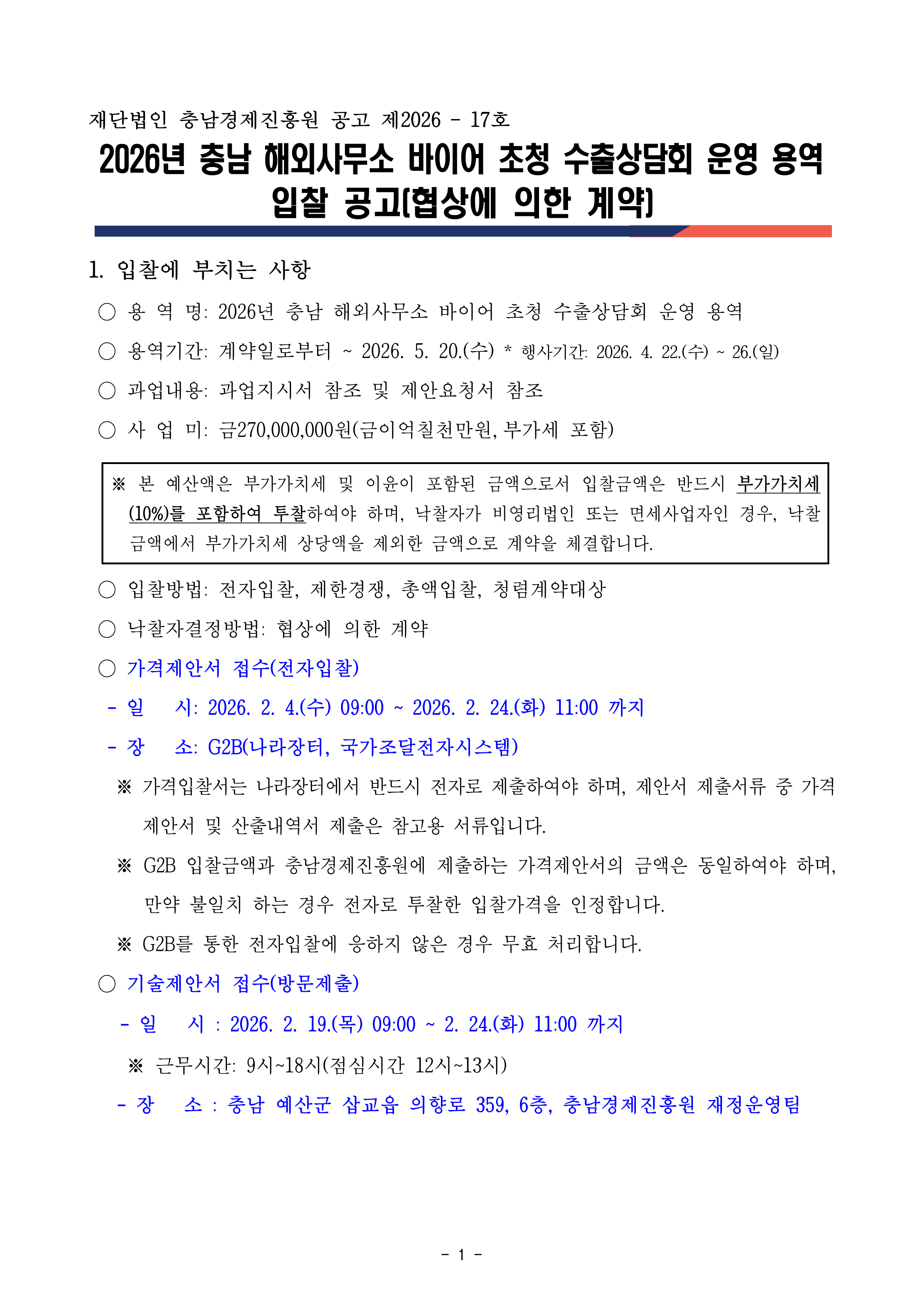 | 2026년 충남 해외사무소 바이어 초청 수출상담회 운영 용역 입찰 공고 |