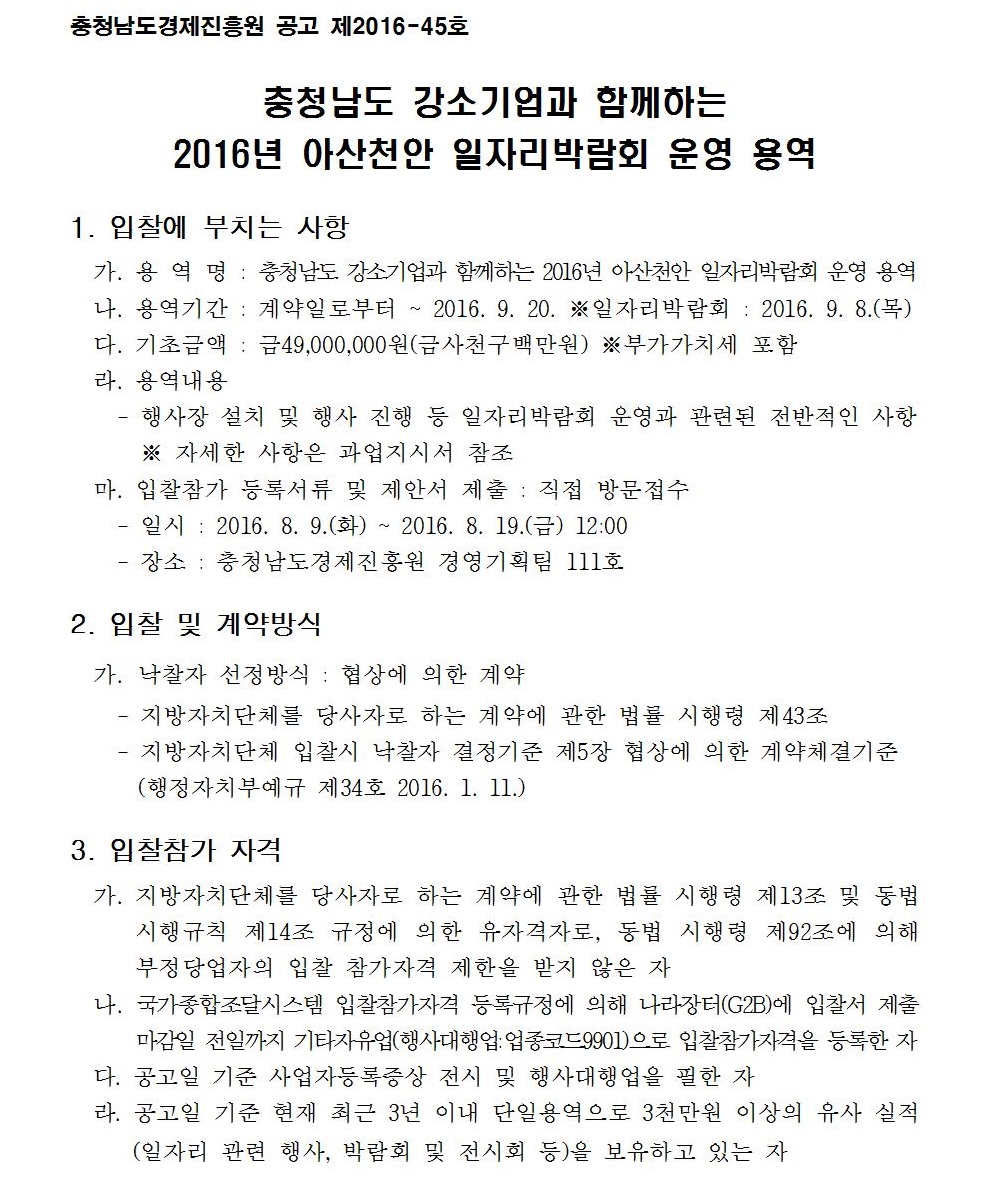 | 충청남도 강소기업과 함께하는 2016년 아산천안 일자리박람회 운영 용역 입찰공고 |