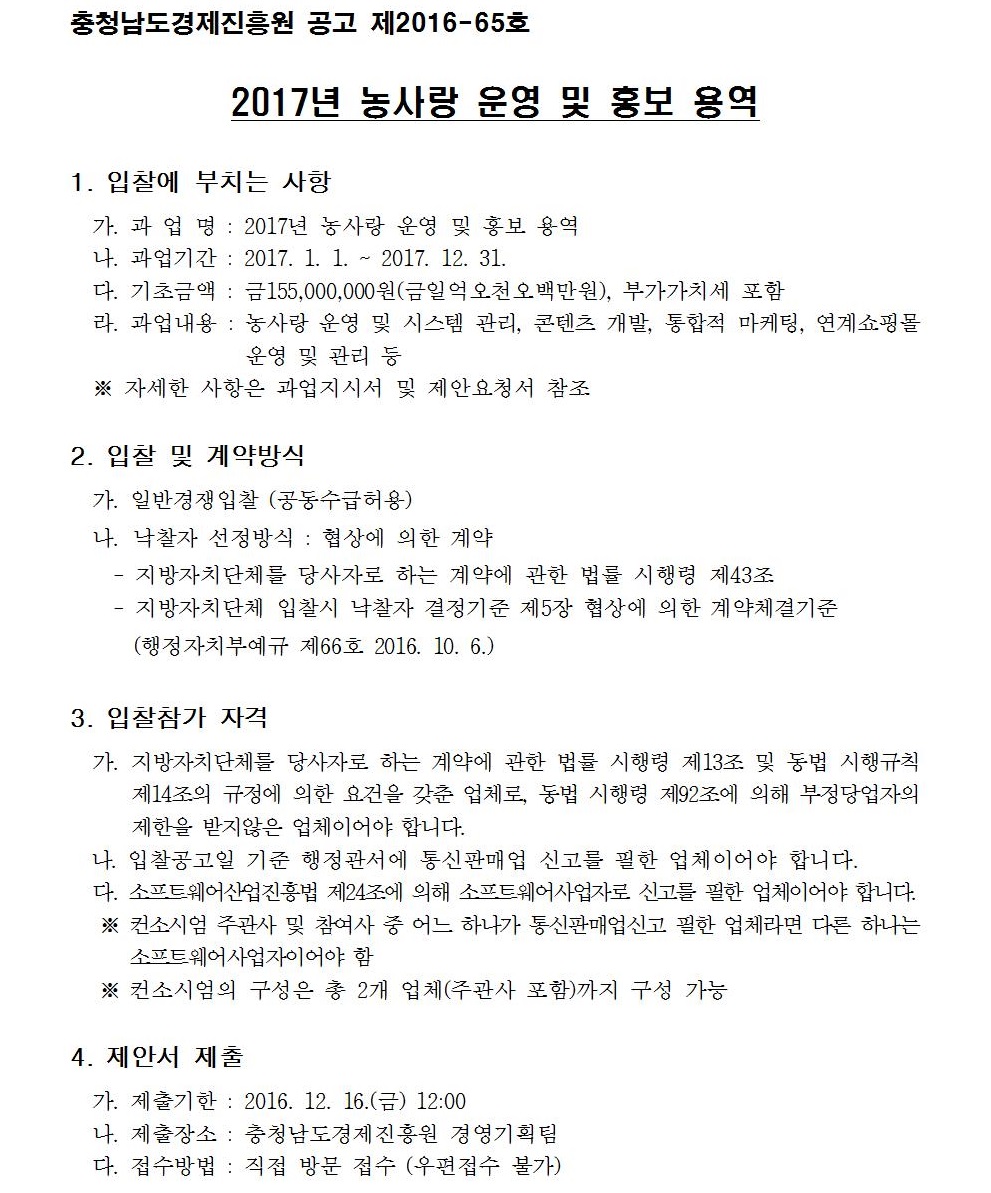 2017년 농사랑 운영 및 홍보 용역 입찰 공고