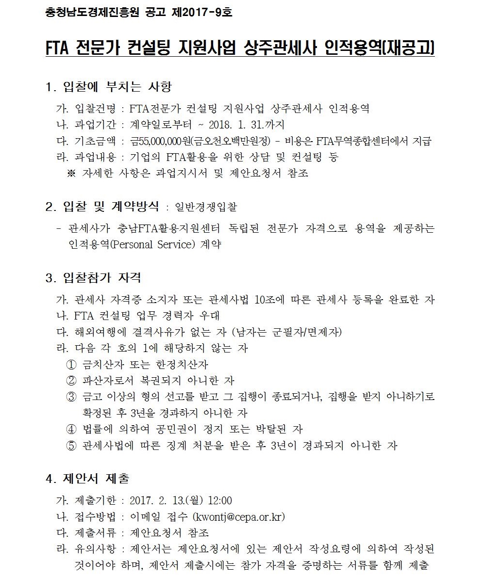 FTA 전문가 컨설팅 지원사업 상주관세사 인적용역 입찰 재공고