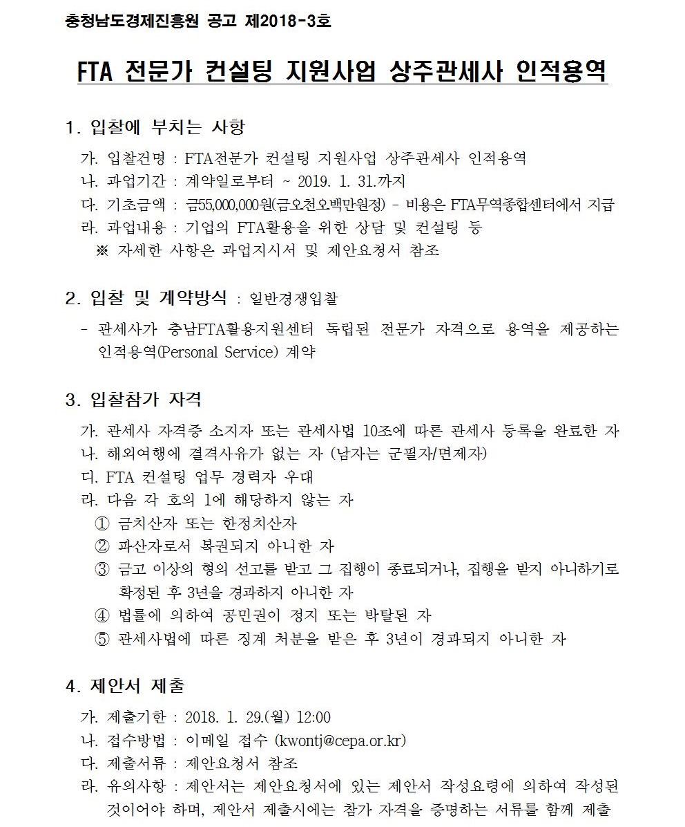 FTA 전문가 컨설팅 지원사업 상주관세사 인적 용역계약 입찰 공고