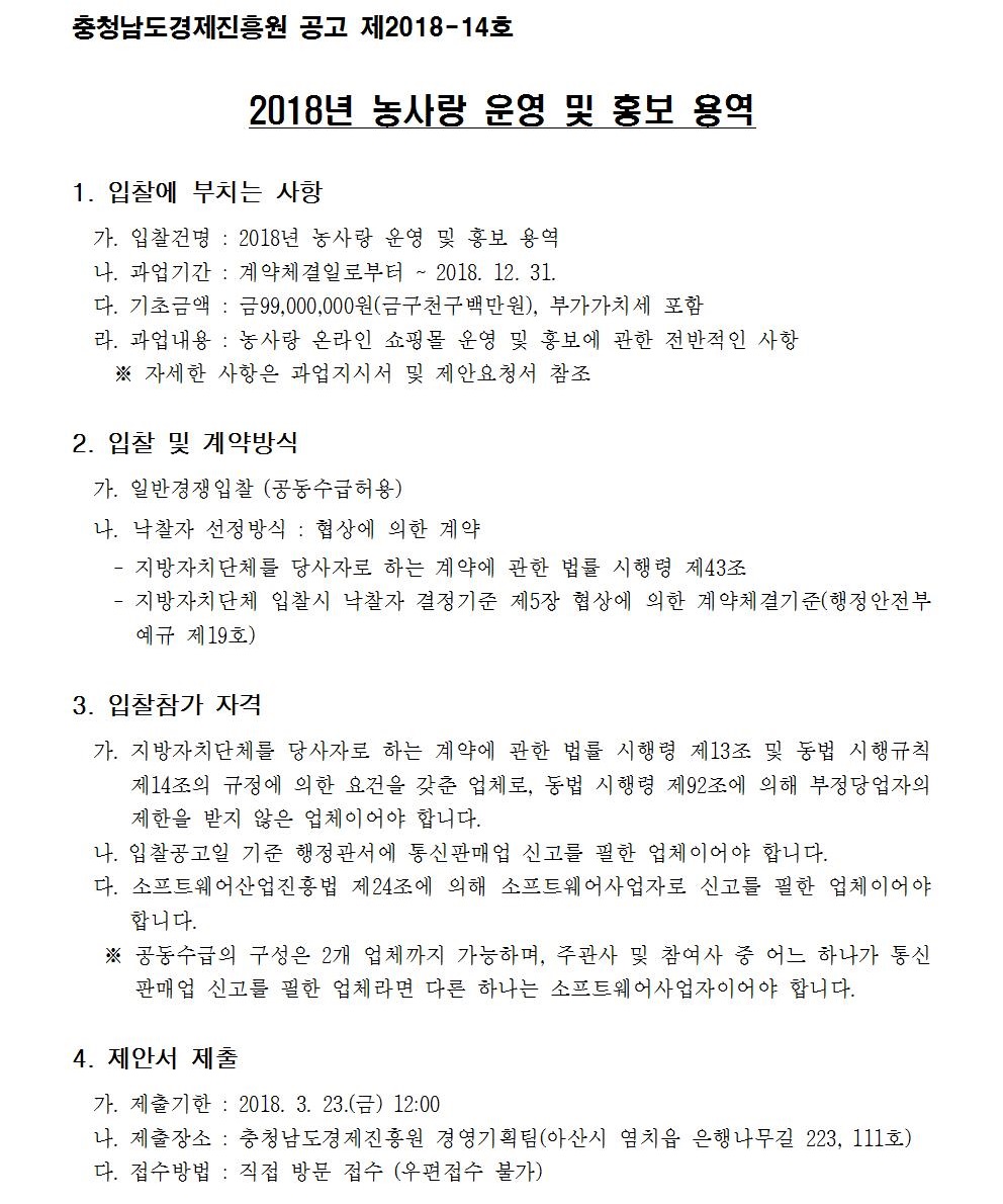 2018년 농사랑 운영 및 홍보 용역 입찰 공고