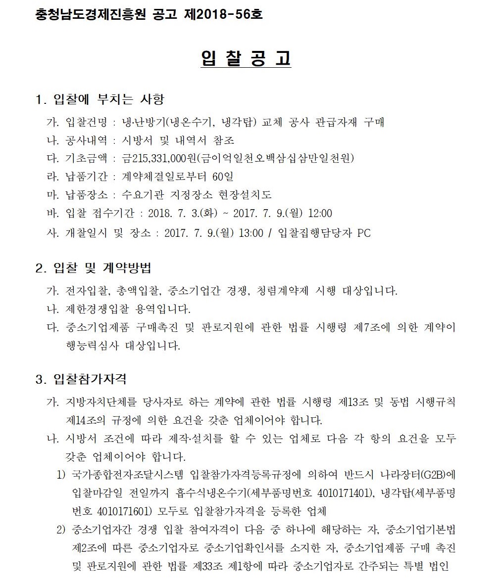 냉·난방기(냉온수기, 냉각탑) 교체 공사 관급자재 구매 입찰 재공고
