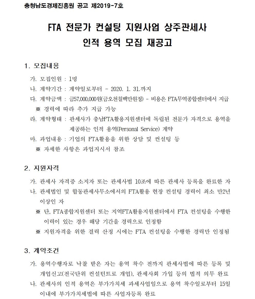 FTA 전문가 컨설팅 지원사업 상주관세사 인적 용역 모집 재공고