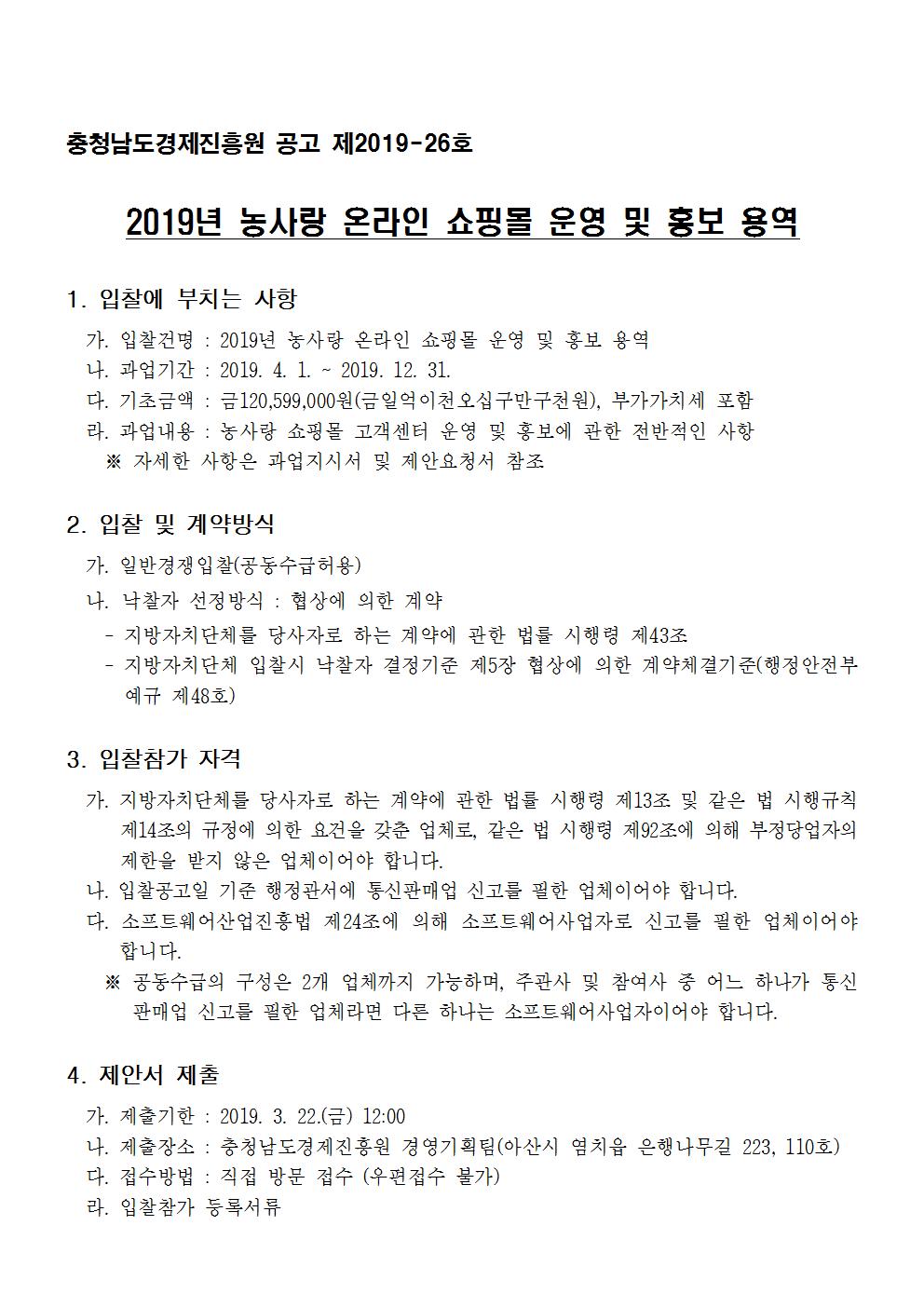 2019년 농사랑 온라인 쇼핑몰 운영 및 홍보 용역 입찰 공고