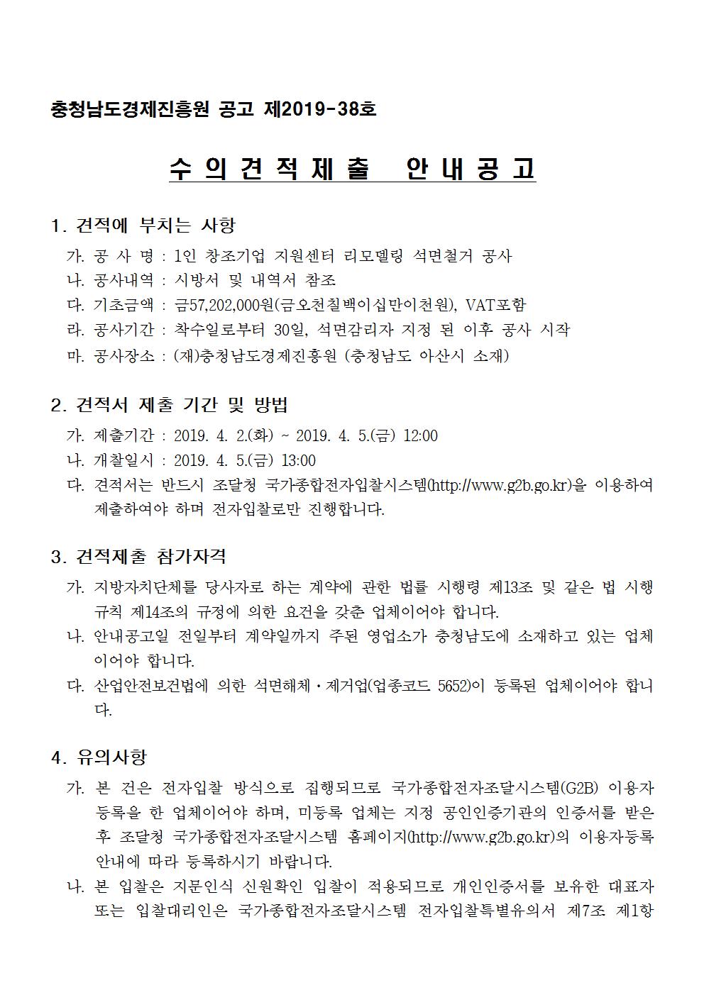 1인 창조기업 지원센터 리모델링 석면철거 공사 수의견적제출 안내공고