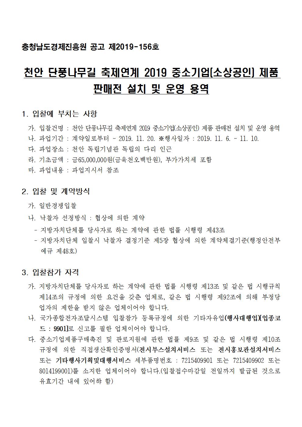 | 천안 단풍나무길 축제연계 2019 중소기업(소상공인) 제품 판매전 설치 및 운영 용역 입찰 |