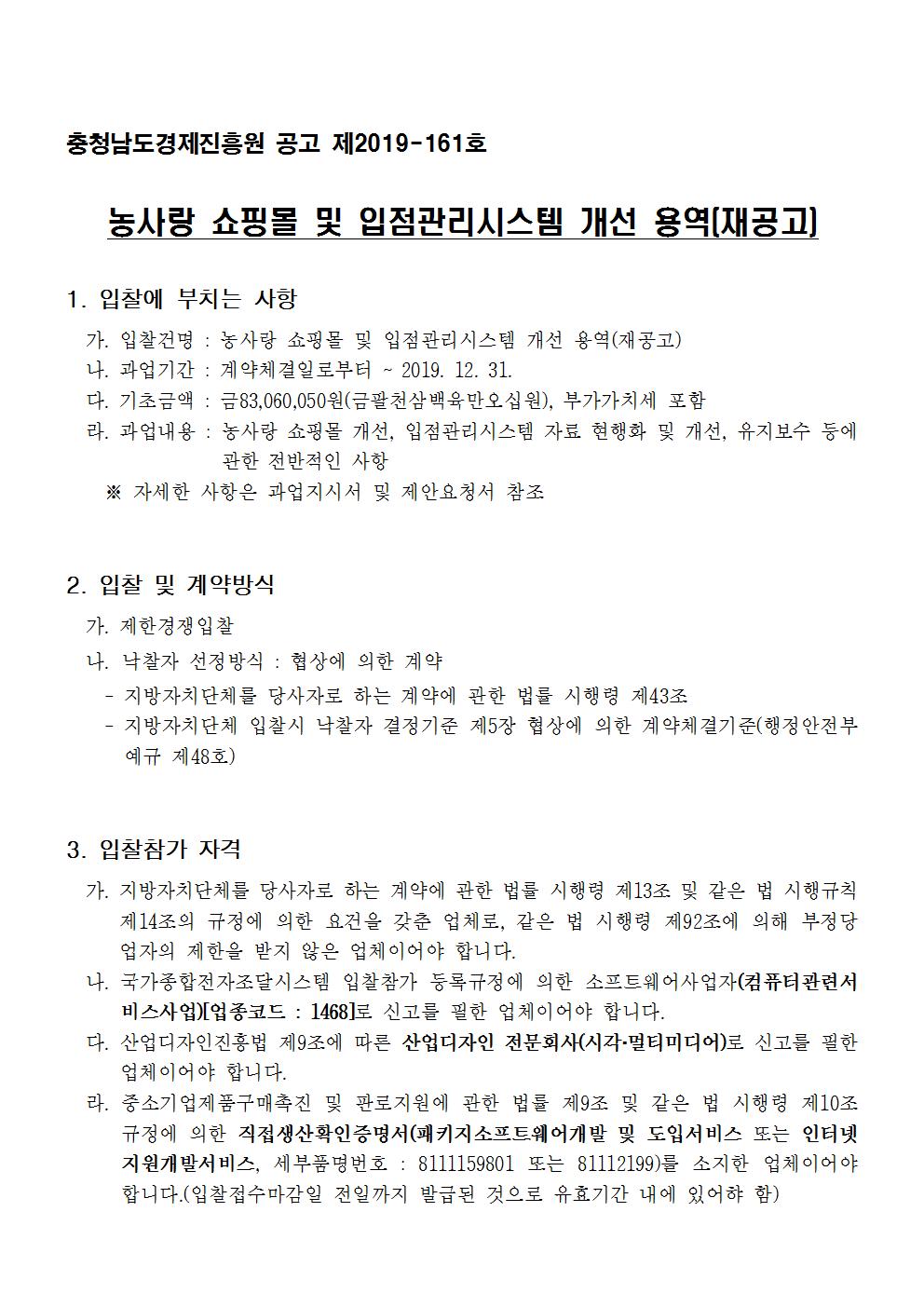 농사랑 쇼핑몰 및 입점관리시스템 개선 용역 입찰 재공고