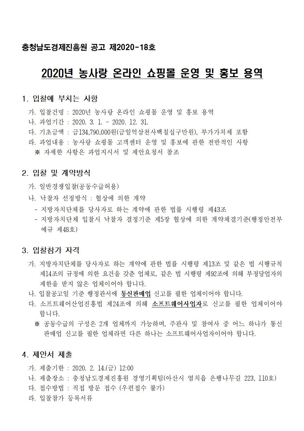 | 2020년 농사랑 온라인 쇼핑몰 운영 및 홍보 용역 입찰 공고 |