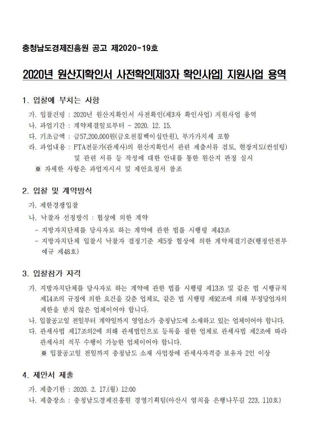 | 2020년 원산지확인서 사전확인(제3자 확인사업) 지원사업 용역 입찰 모집공고 |