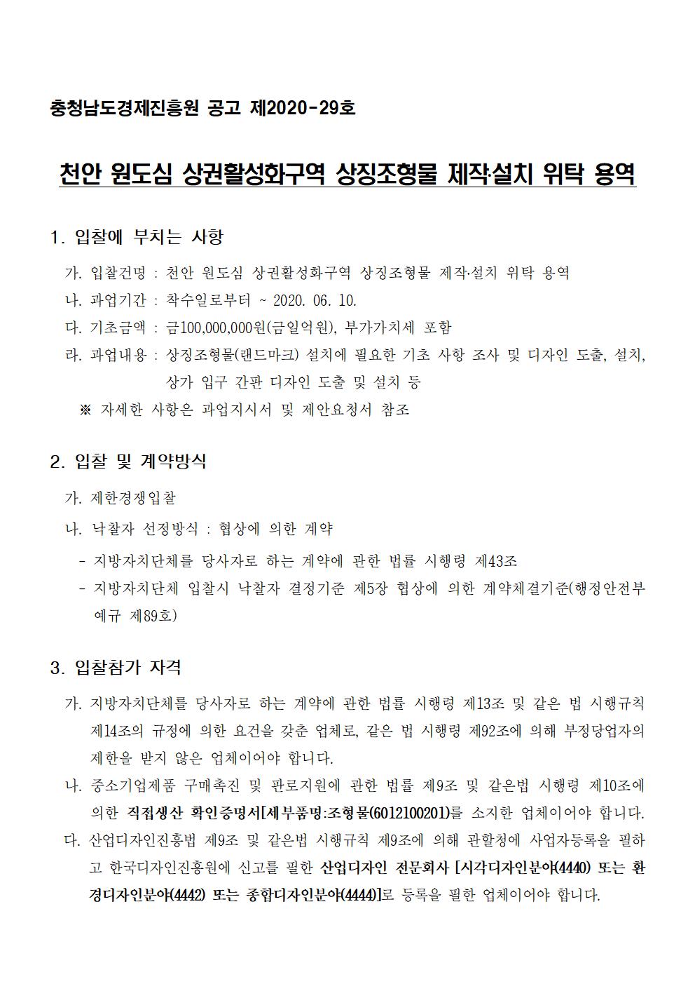 | 천안 원도심 상권활성화구역 상징조형물 제작·설치 위탁 용역 입찰 공고 |