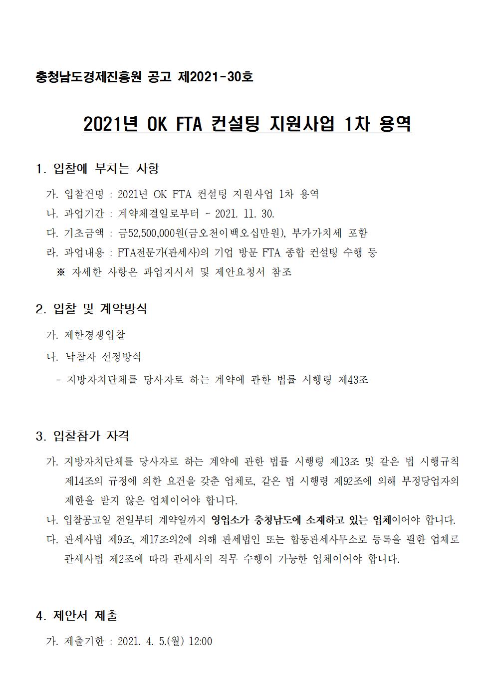 | 2021년 OK FTA 컨설팅 지원사업 1차 용역 입찰 공고 |