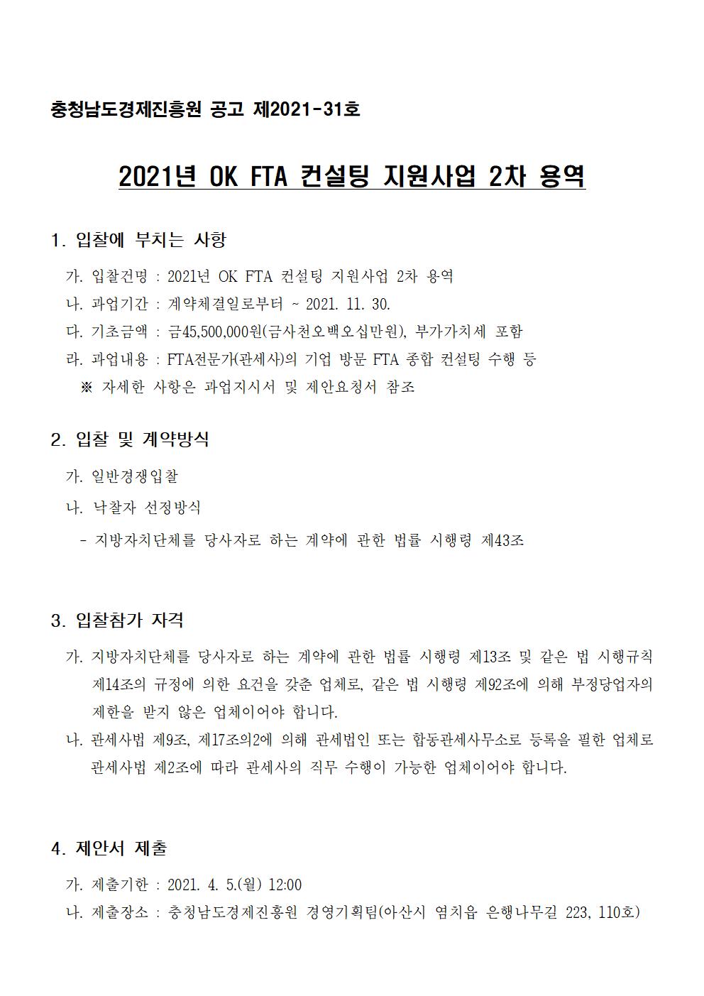 | 2021년 OK FTA 컨설팅 지원사업 2차 용역 입찰 공고 |