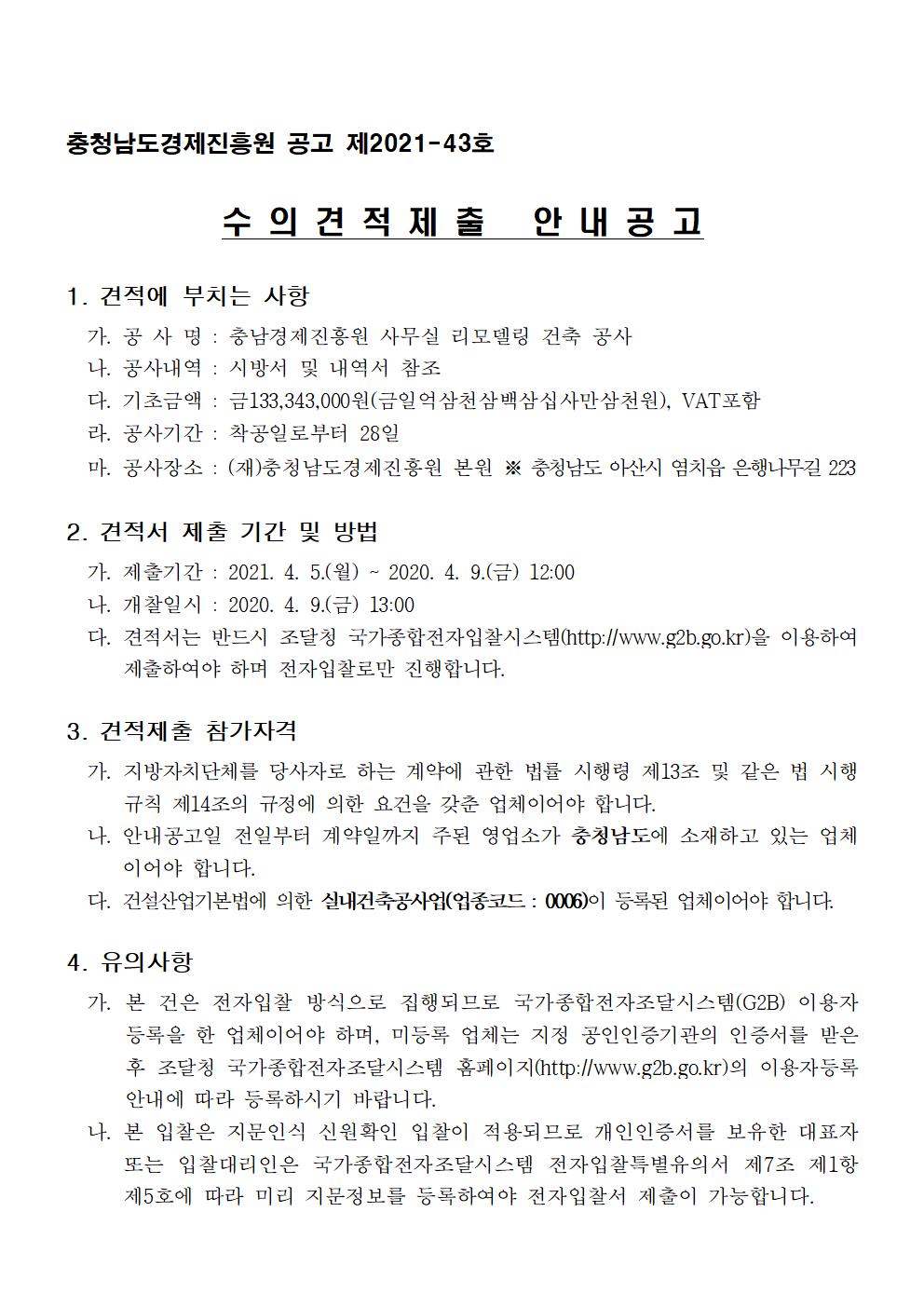 | 충남경제진흥원 사무실 리모델링 건축 공사 소액수의견적제출 안내 공고 |