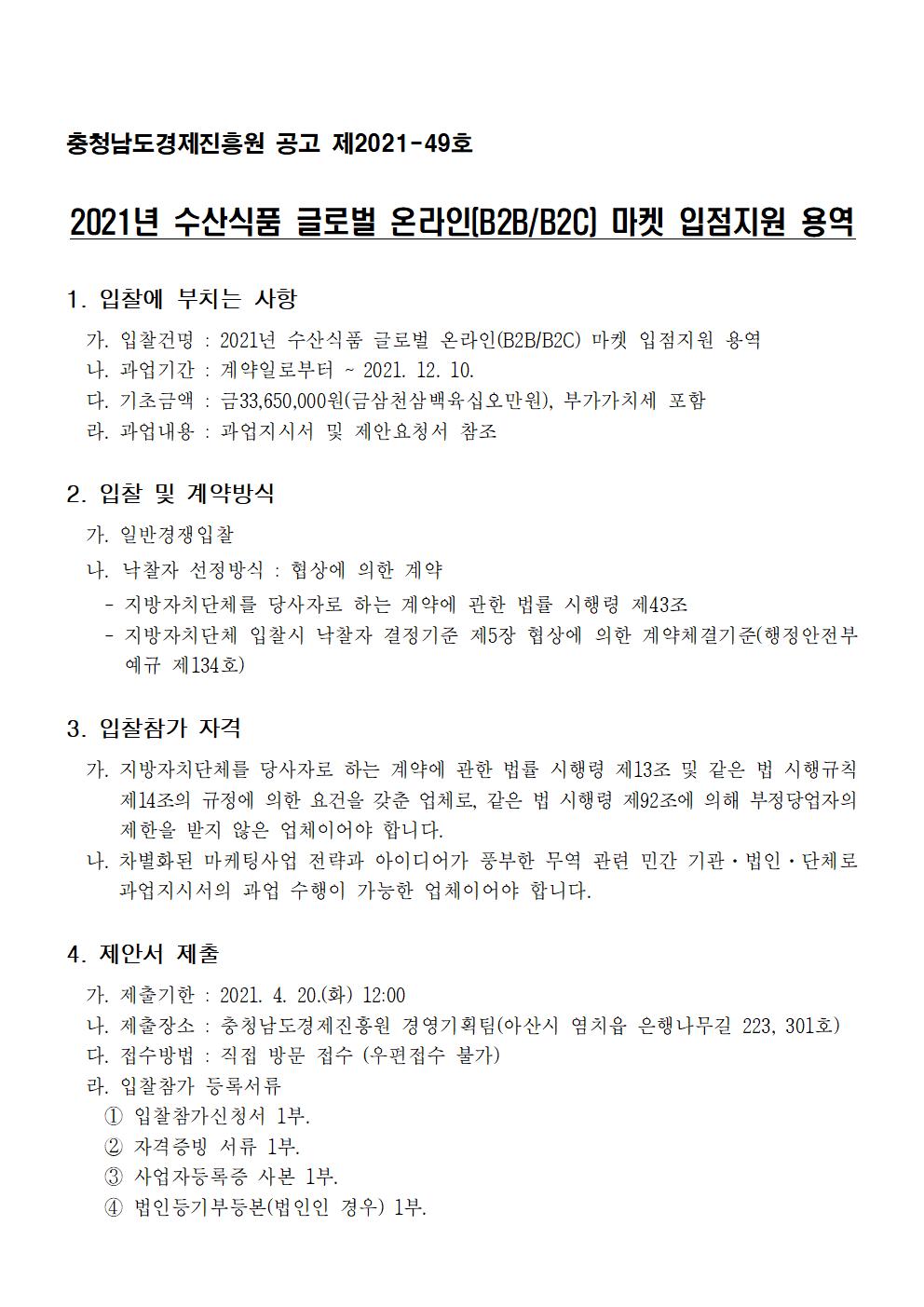 | 2021년 수산식품 글로벌 온라인(B2B/B2C) 마켓 입점지원 용역 입찰 공고 |