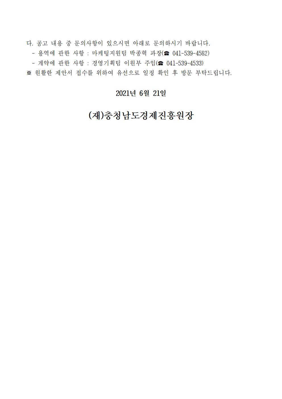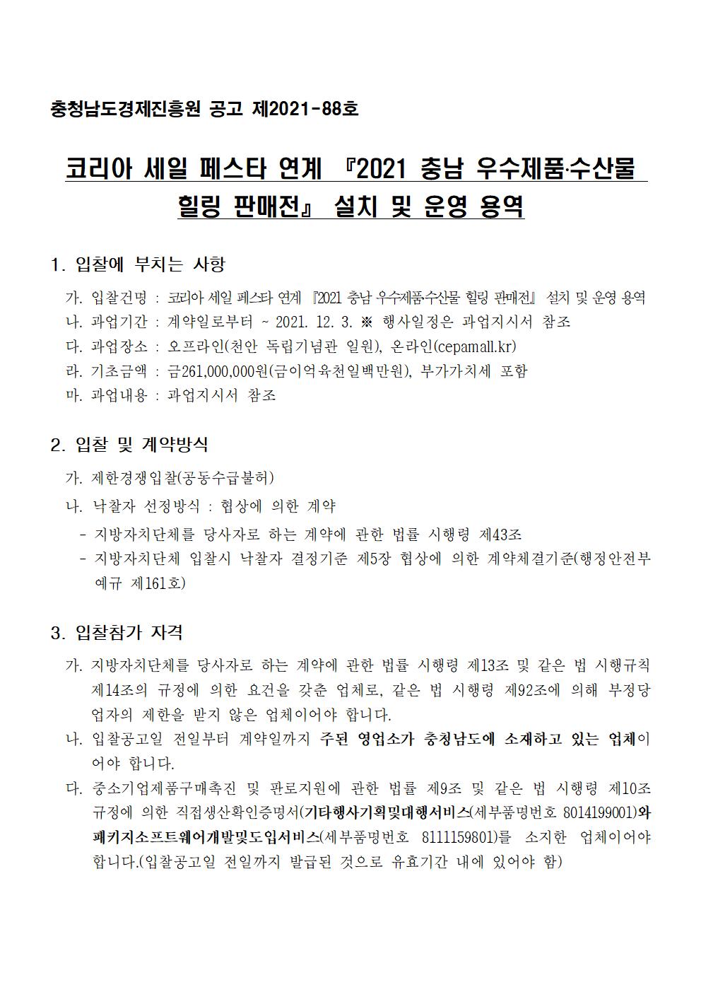 | 코리아 세일 페스타 연계 「2021 충남 우수제품·수산물 힐린 판매전」 설치 및 운영 용역 입찰 공고 |