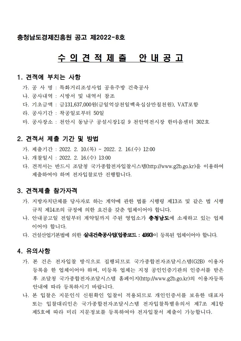 | 2022 특화거리조성사업 공유주방 건축공사 소액수의견적제출 안내 공고 |