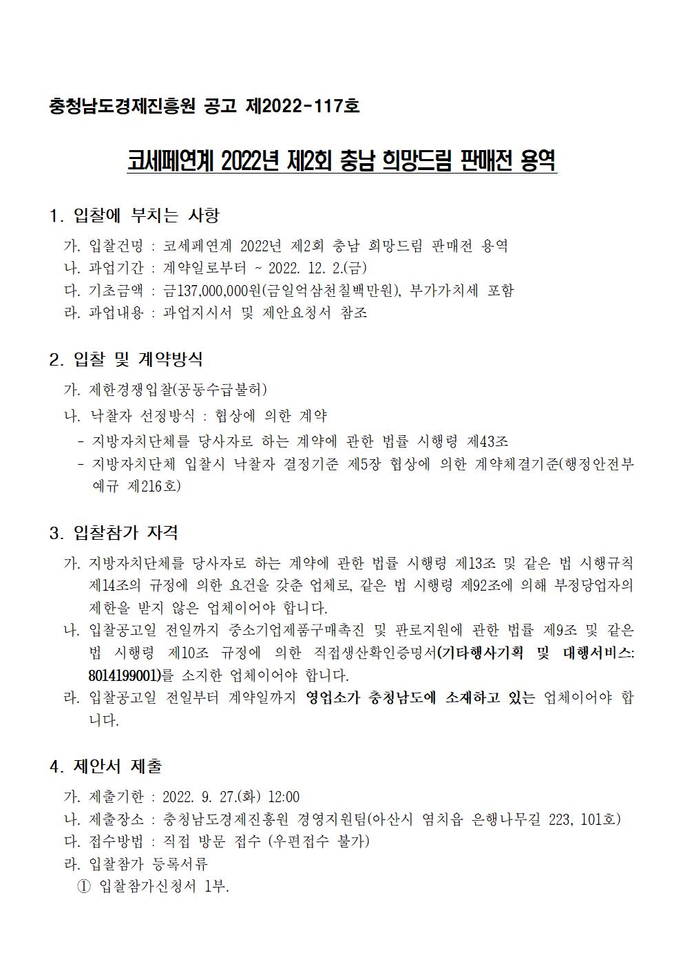 | 코세페연계 2022년 제2회 충남 희망드림 판매전 용역 |