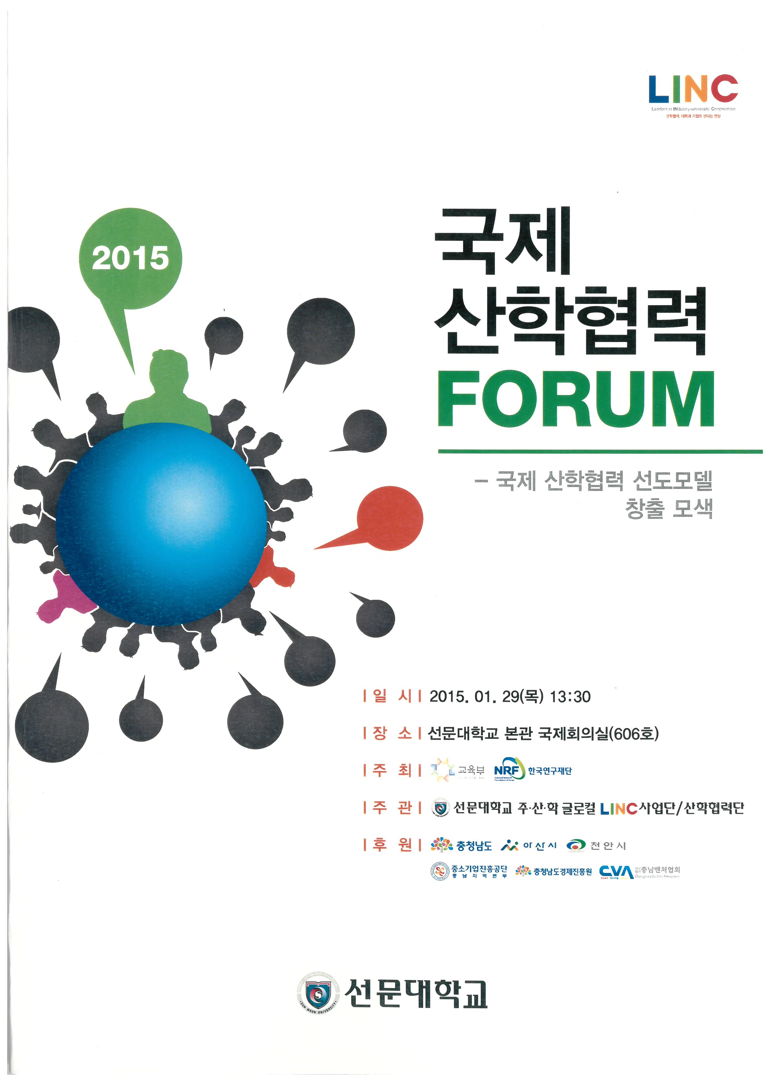 일시 : 2015년 1월 29일(목) 13:30 장소 : 선문대학교 본관 국제회의실 주최 : 교육부, 한국연구재단 주관 : 선문대학교 주산학글로컬LINC사업단/산학협력단 후원 : 충청남도, 아산시, 천안시, 중소기업진흥공단충남지역본부, 충남경제진흥원, 충남벤처협회