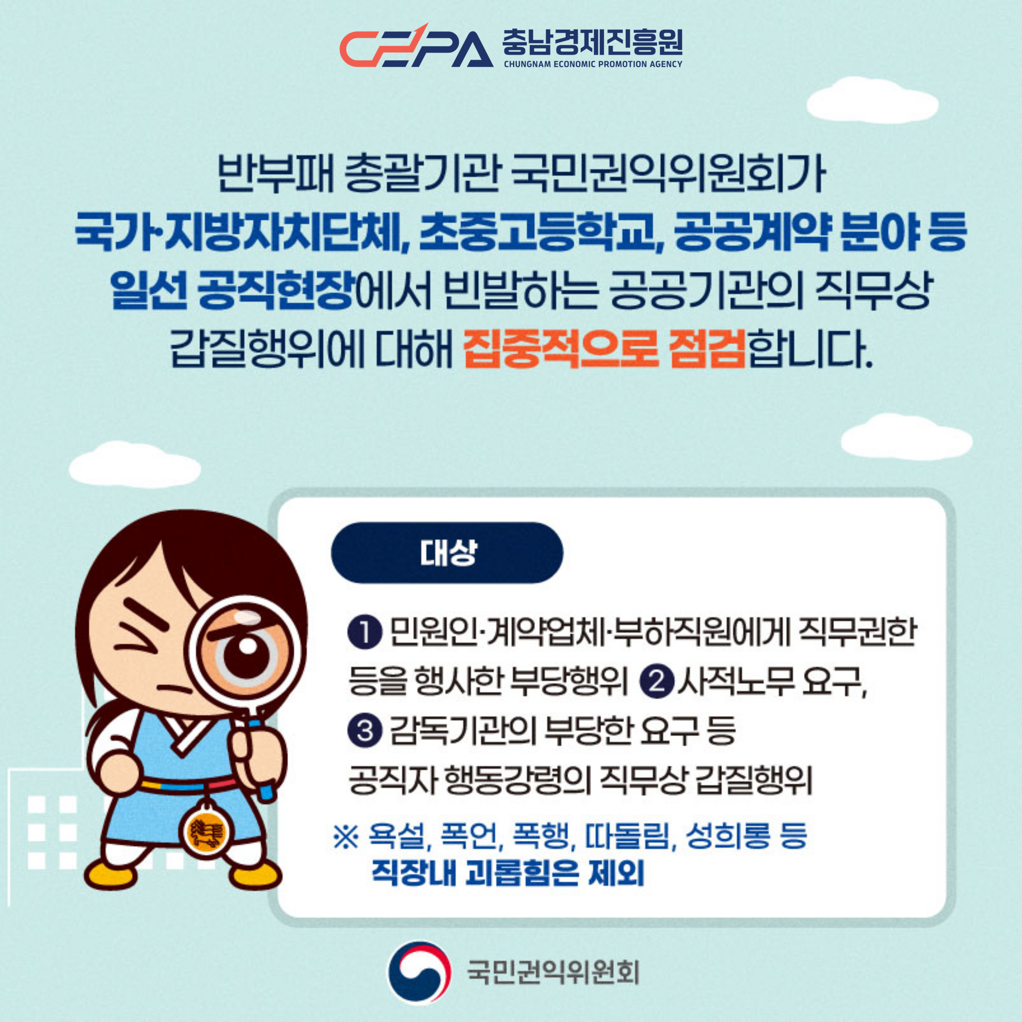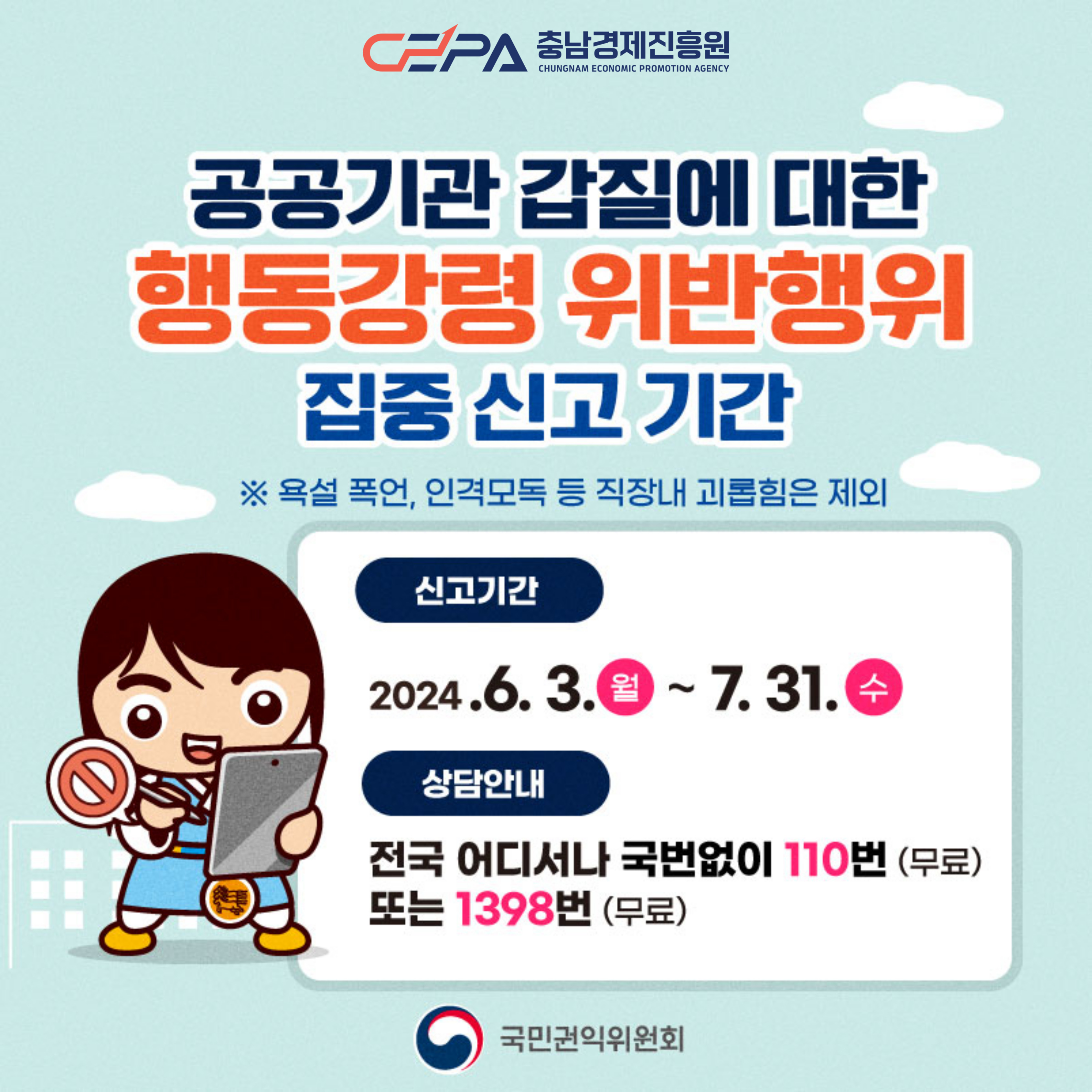 안녕하세요. 성장하는 충남경제를 만들어 가는 충남경제진흥원입니다! 국민권익위원회에서 부패취약분야 경각심 및 신고 활성화를 제고하기 위해 일선 공직현장에서 빈발하는 직무상 갑질에 대한 행동강령 위반행위 집중 신고 기간을 아래와 같이 운영합니다. ■ 기간 : '24. 6. 3.(월) ~ 7. 31.(수)(약 2개월) ■ 대상 : ① 민원인·계약업체·부하직원에게 직무권한 등을 행사한 부당행위 ② 사적노무 요구 ③ 감독기관의 부당한 요구 등 공공기관의 직무상 갑질행위 ※ 욕설, 폭언, 인격모독, 따돌림, 성희롱 등 직장내 괴롭힘은 제외 ■ 신고방법 : 청렴포털_부패공익신고(www.clean.go.kr) 등 / 국번없이 110번 또는 1398번(무료) ■ 처리 : 확인된 행동강령 위반행위는 소속기관에 통보하여 징계 등 필요한 조치 * 국민권익위원회 주소 : 청렴포털부패공익신고/신고하기/부패신고(행동강령포함) |