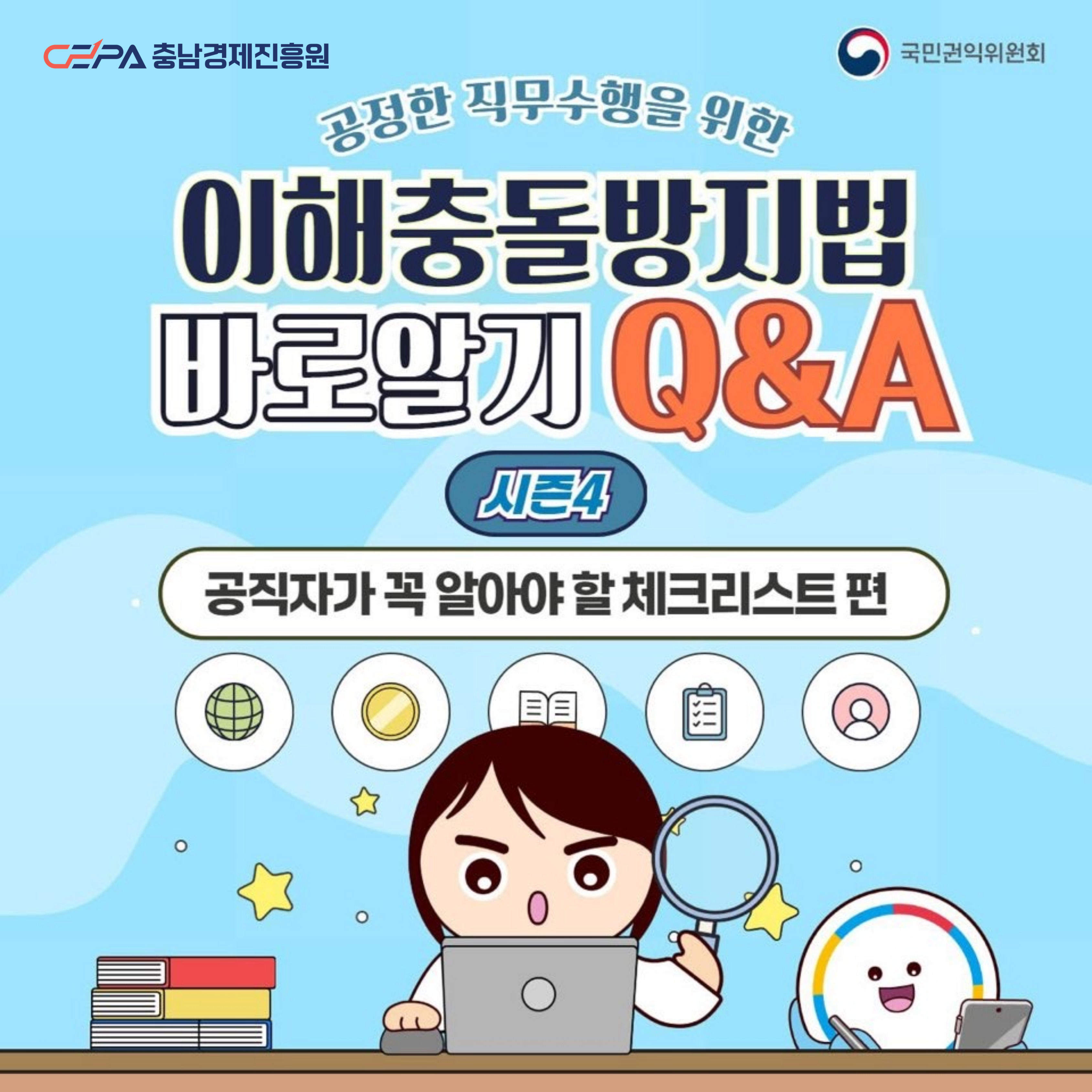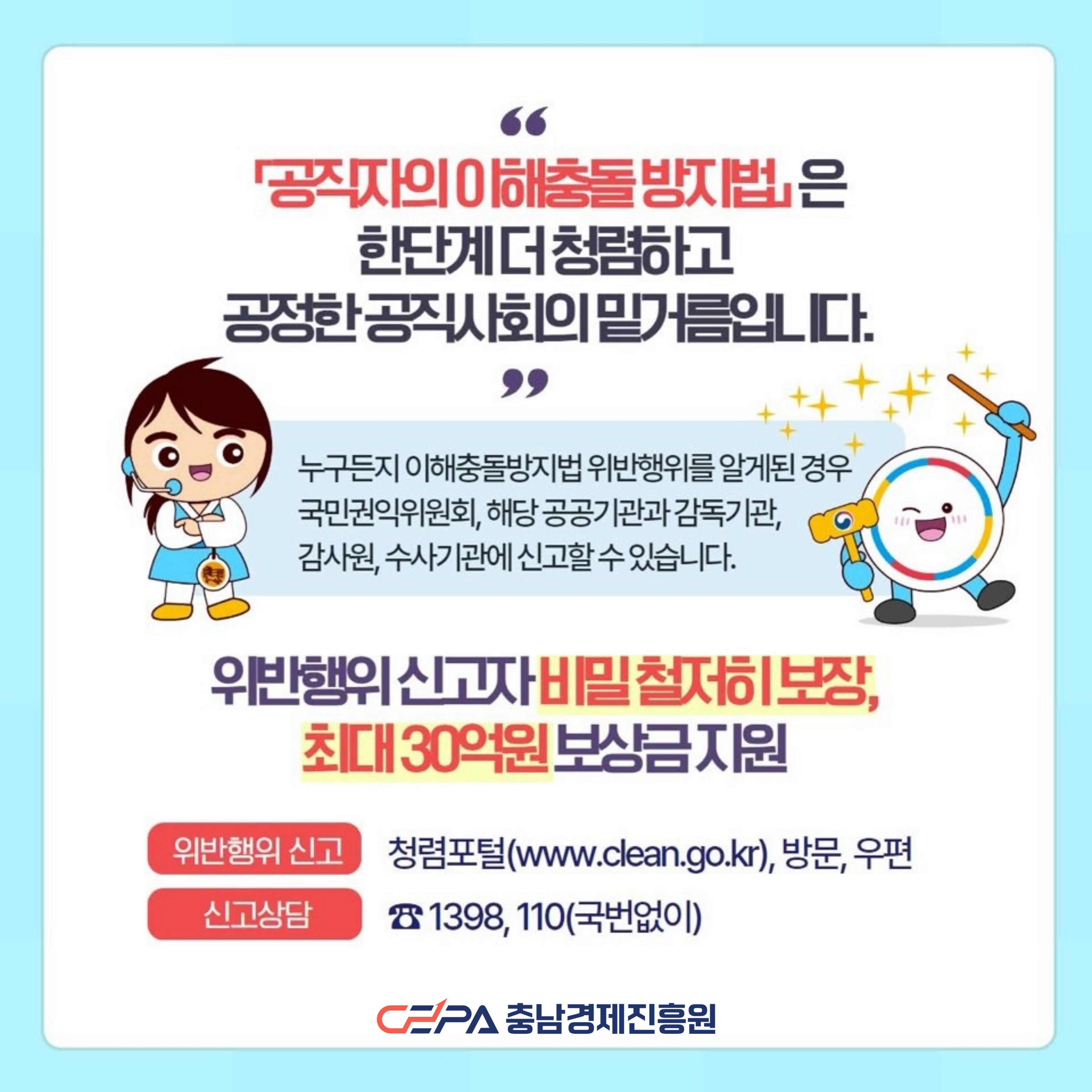 안녕하세요. 성장하는 충남경제를 만들어 가는 '충남경제진흥원' 입니다. 「공직자의 이해충돌 방지법」은 한단계 더 청렴하고 공정한 공직사회의 밑거름입니다. 충남경제진흥원 임직원은 한 단계 더 청렴하고 공정한 공직사회를 만들어 가는 사명감을 갖고, 국민 모두가 공감하는 윤리경영을 실천하여 청렴문화를 확산시키는 기관으로 항상 노력하겠습니다. 감사합니다. |