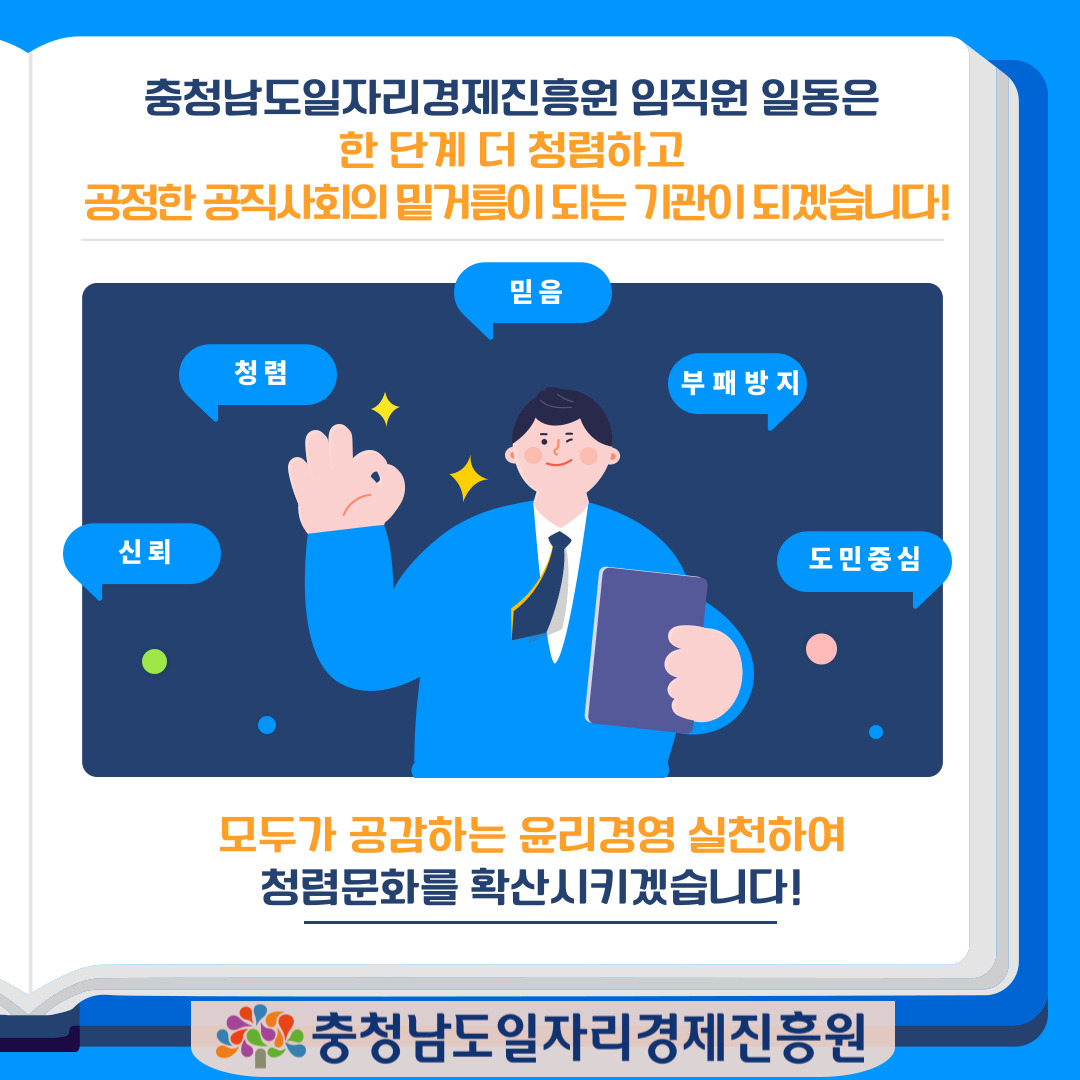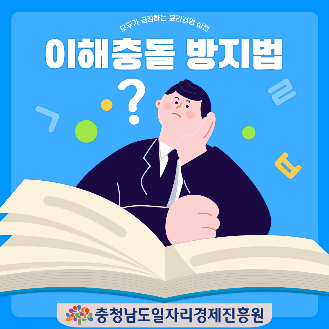 안녕하세요. 충남 경제를 선도하는 혁신성장 1등 기관! 충청남도일자리경제진흥원 입니다. 우리 진흥원은 자체 제작한 이해충돌 방지법 관련 카드뉴스를 공유함으로 공공기관으로서 한 단계 더 청렴하고 공정한 공직사회의 밑거름이 되는 기관으로 나아가겠습니다. 모두가 공감하는 윤리경영을 실천하여 청렴문화를 확산시키는 그 날 까지! 충청남도일자리경제진흥원은 항상 노력하겠습니다. 감사합니다!