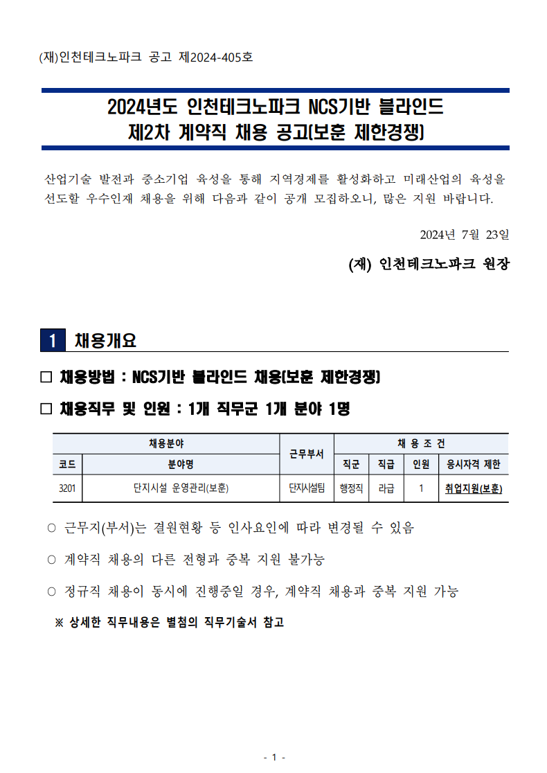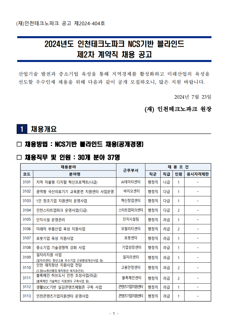 | [인천테크노파크] 2024년 제2차 계약직 채용 공고 |