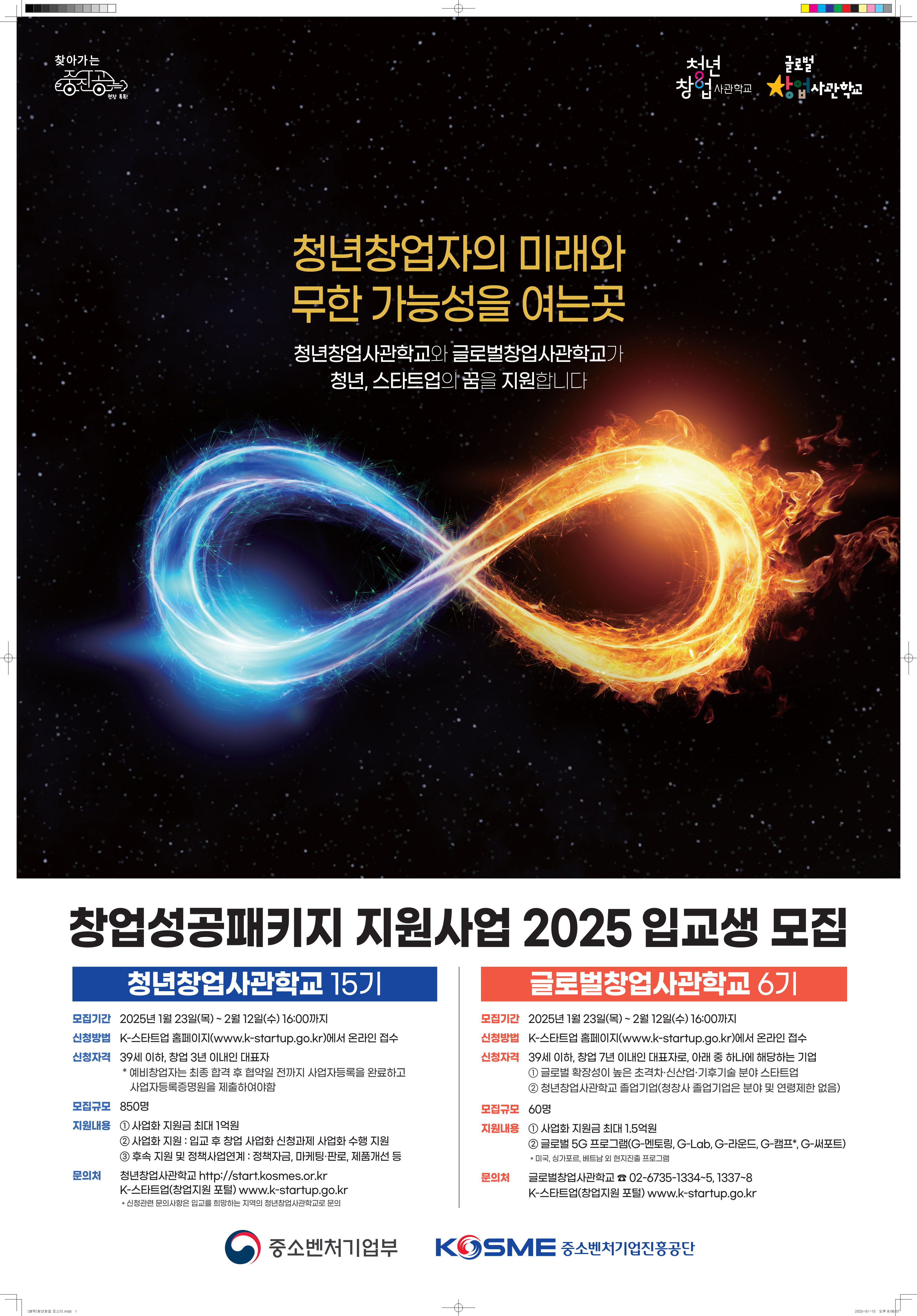 1. 입교대상(공고일 ‘25.1.23 기준) 2. 선발 및 사업화 지원 일정/지원내용 3. 모집공고 및 신청 접수 4. 문의 : 충남(천안) 041–559-9283~9 |