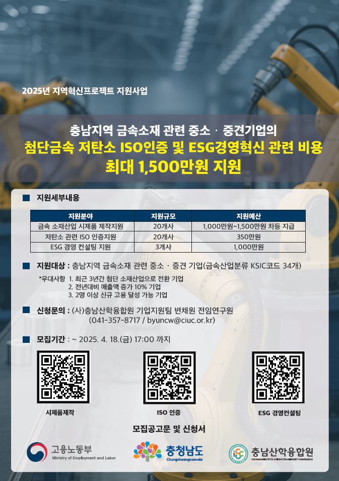* 모집기간 : 2025. 4. 18.(금) 17:00 까지 * 신청문의 : (사)충남산학융합원 기업지원팀 변채원 전임연구원 (041-357-8717 / byuncw@ciuc.or.kr)