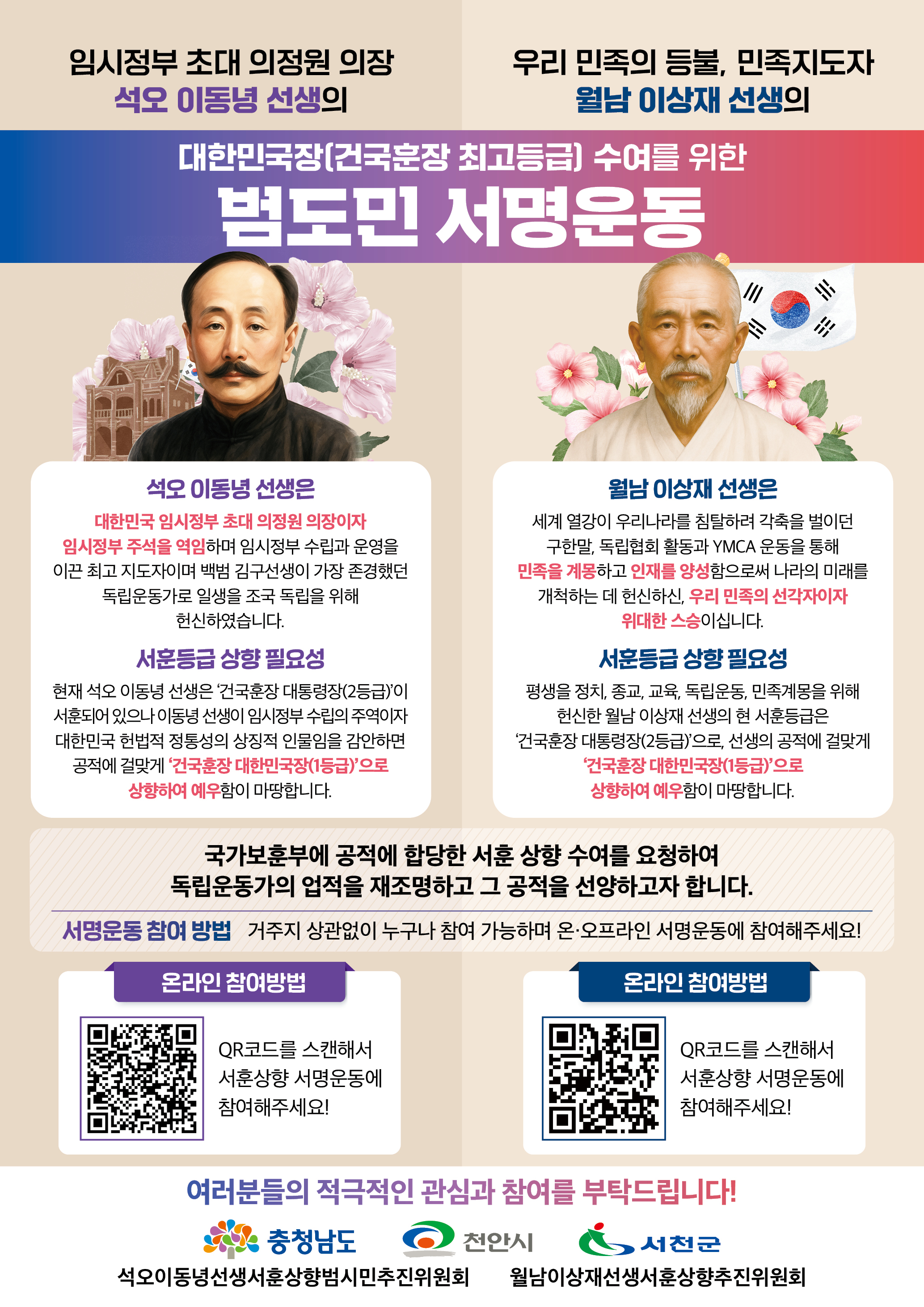 | [충청남도, 천안시, 서천군] 석오 이동녕, 월남 이상재 선생 서훈상향 추진 범도민 서명운동 |