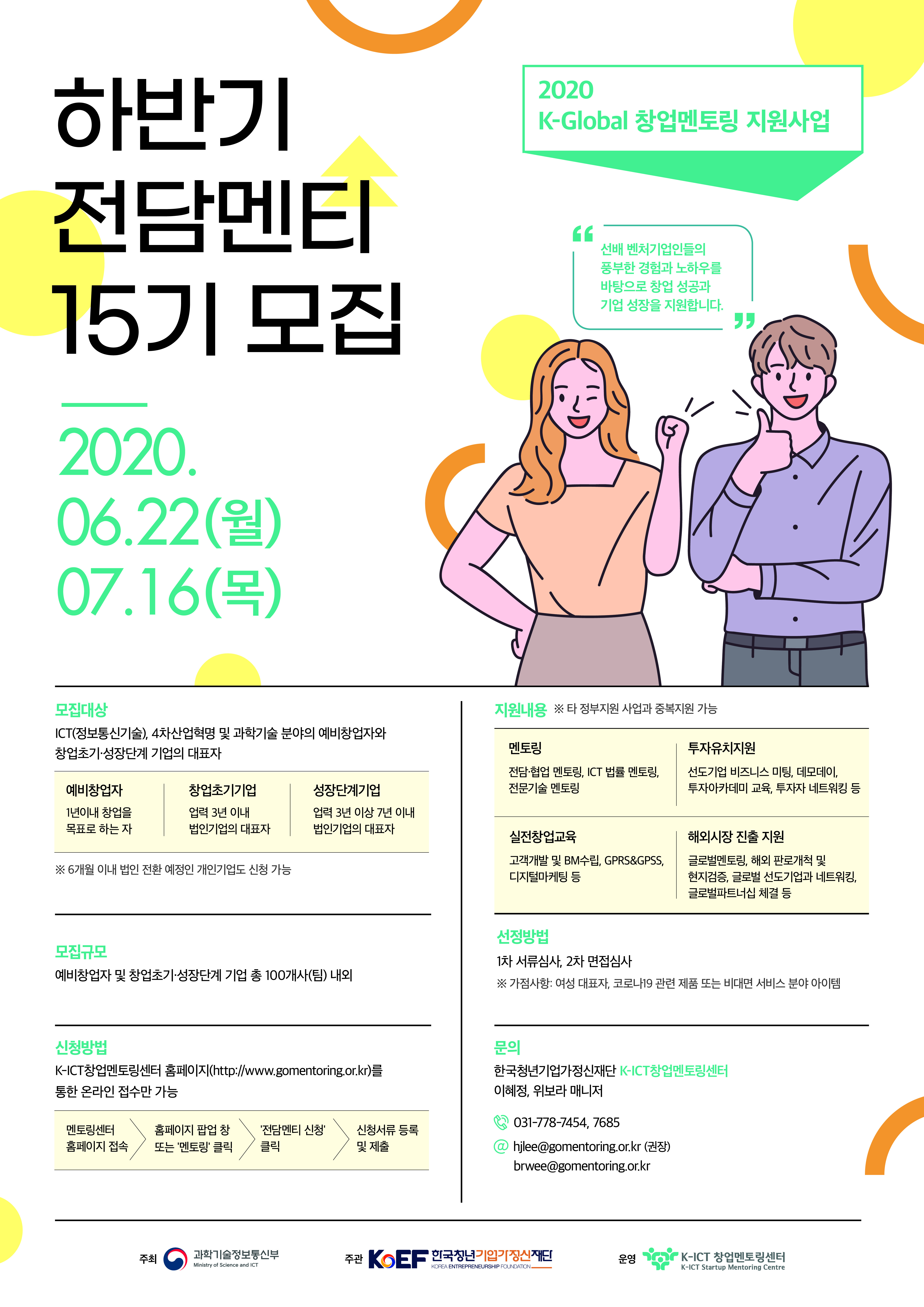 | [K-ICT창업멘토링센터 ] 과학기술정보통신부 주관 2020년 하반기『K-Global 창업멘토링 지원사업』전담멘티(15기) 모집 공고 |