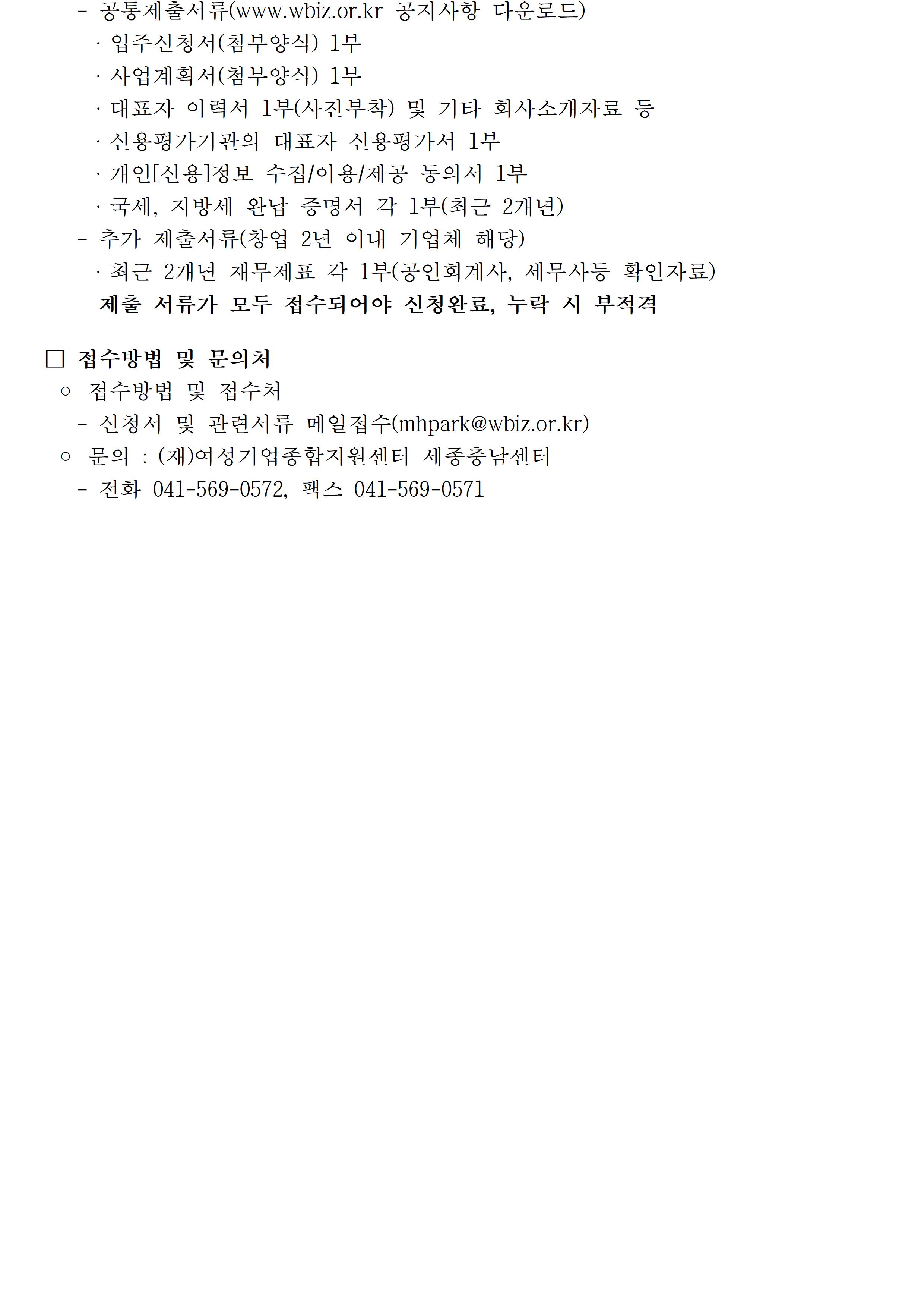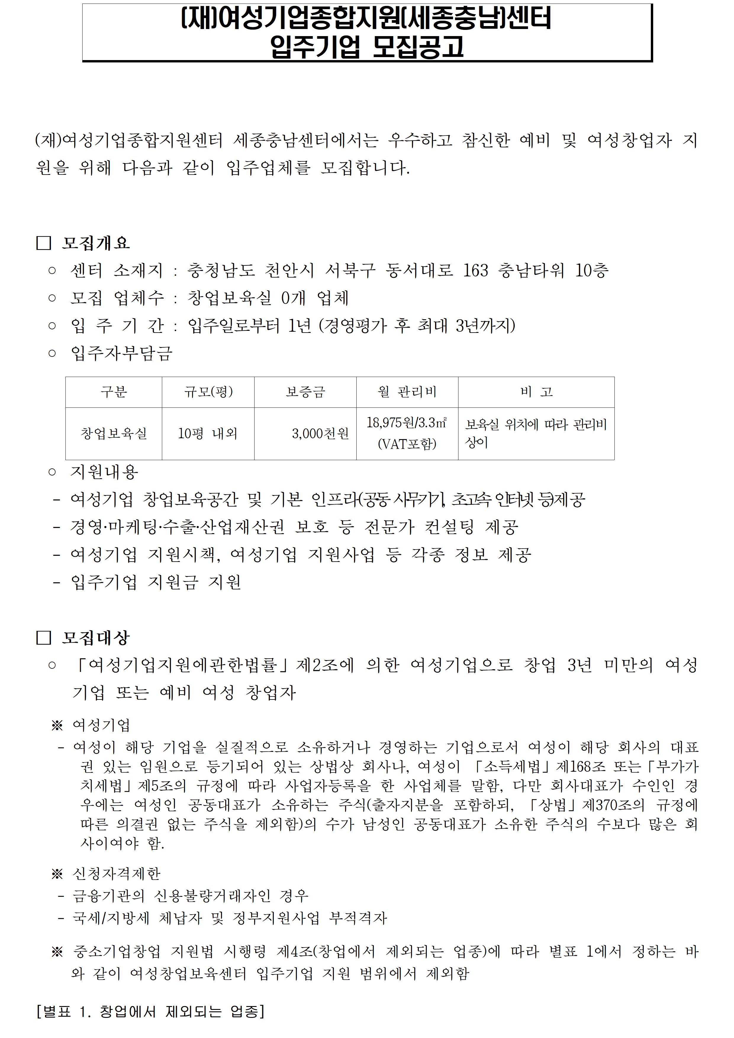 [(재)여성기업종합지원센터 충남센터] 신규 입주기업 모집공고