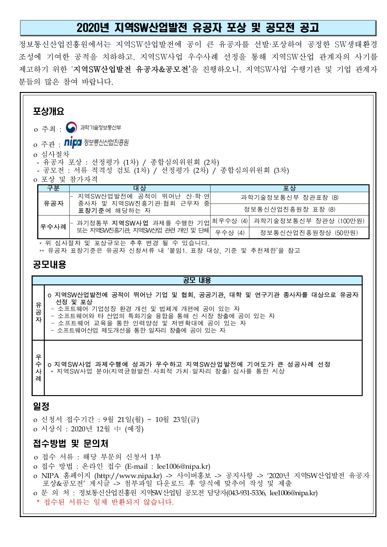[정보통신산업진흥원] 2020년 지역SW산업발전 공모전 공고문